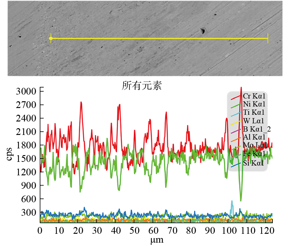 钎焊过程中,由于钎料润湿母材,与母材的发生相互溶解和扩散,致使液态钎料的成分、密度、粘度和熔化温度区间等发生变化,影响钎焊过程中液态钎料的润湿及毛细填缝作用。而在钎缝中包含了大量不含脆性化合物的固溶体相,使得接头的强度和塑性大大提高。为进一步分析元素扩散程度,如表4所示,对钎焊温度为1080 ℃时接头处的能谱成分进行分析。与表1~3相比,发现蜂窝侧Fe、Si、Al、Ni增多,钎料的Cr、Si、Fe、Ni减少,Fe基本不变,说明钎料中减少的Cr、Si、Fe、Ni元素基本扩散到了蜂窝侧;而Cr、Ti在3个区域互有扩散。这些变化从侧面说明钎焊时,钎料与板材、钎料与蜂窝均出现较明显的扩散现象,而钎料中的Cr、Si、Fe、Ni 4种元素促进了钎料与基体、蜂窝的结合,与相关钎焊试验研究结论类似[ 杜鹏, 宋晓国, 龙伟民, 等. Zr/CoCrFeMnNi HEA钎焊接头界面组织与力学性能研究[J]. 稀有金属材料与工程, 2025, 54(2): 385–393.DU Peng, SONG Xiaoguo, LONG Weimin, et al. Interfacial microstructure and mechanical properties of Zr/CoCrFeMnNi HEA brazed joints[J]. Rare Metal Materials and Engineering, 2025, 54(2): 385–393. 姜伟, 于康, 李心怡, 等. 高熵合金钎焊C/C–GH4169接头的微观组织及力学性能[J]. 稀有金属材料与工程, 2025, 54(2): 429–436.JIANG Wei, YU Kang, LI Xinyi, et al. Microstructure and mechanical properties of C/C–GH4169 joint brazed with high entropy alloy[J]. Rare Metal Materials and Engineering, 2025, 54(2): 429–436. 12-13]。为深入了解接头区域元素扩散行为,对接头区域进行了线扫描,结果如图8所示。可以看出,采用BSD电子扫描观察,钎料区和板材基体无明显分界线。如图9所示,线扫描结果表明,蜂窝与板材交界位置Cr、Ni、Ti、W、B、Al、Mo、Fe、Si元素分布均匀。B–Ni73CrSiB–40Ni–S作为镍基高温合金,Ni的质量分数应该为最大,但线扫描中Ni的cps值反而小于Cr,充分说明钎料元素与板材基体扩散充分,也印证了Cr、Si、Fe、Ni 4种元素促进了钎料与基体、蜂窝的结合。