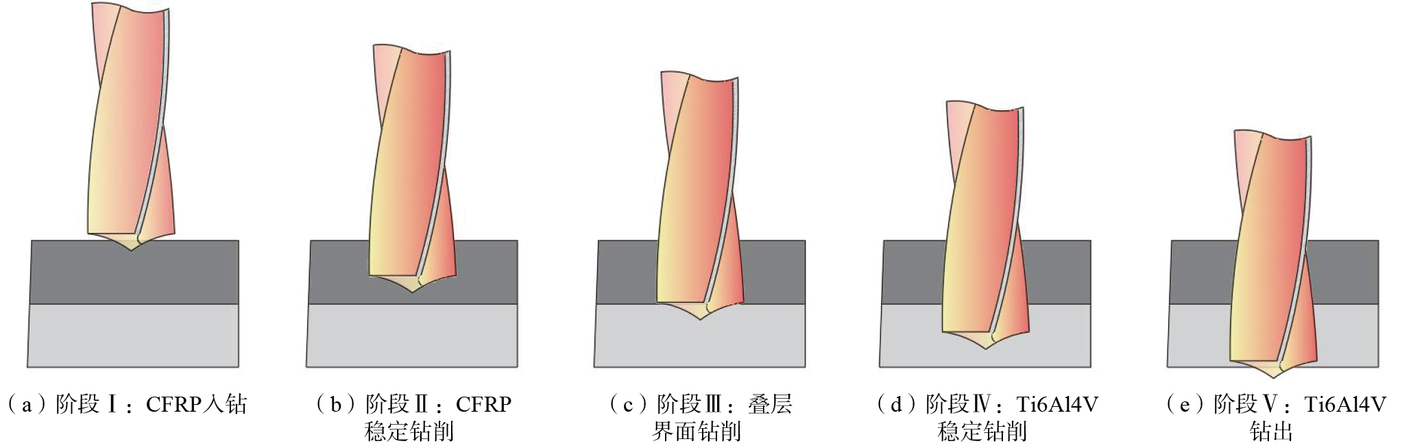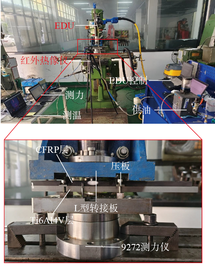 碳纤维增强树脂基复合材料(Carbon fiber reinforced polymer,CFRP)具有低密度、高比强度、耐疲劳等优点[ 陈燕, 葛恩德, 傅玉灿, 等. 碳纤维增强树脂基复合材料制孔技术研究现状与展望[J]. 复合材料学报, 2015, 32(2): 301–316.CHEN Yan, GE Ende, FU Yucan, et al. Review and prospect of drilling technologies for carbon fiber reinforced polymer[J]. Acta Materiae Compositae Sinica, 2015, 32(2): 301–316. 1]。Ti6Al4V具有比强度高、耐高温、耐腐蚀等特性[ YUAN C G, PRAMANIK A, BASAK A K, et al. Drilling of titanium alloy (Ti6Al4V)—A review[J]. Machining Science and Technology, 2021, 25(4): 637–702. 2],与CFRP组成的叠层结构不仅克服了CFRP冲击强度不足的问题,而且增加了整体结构的疲劳强度,因此该结构在航空航天领域得到了广泛应用[ 索煜豪, 陈涛, 李红博. CFRP/Ti叠层超声辅助变参数钻削界面温度试验研究[J]. 航空制造技术, 2024, 67(9): 70–77.SUO Yuhao, CHEN Tao, LI Hongbo. Experimental research on interface temperature in ultrasonic-assisted variable parameters drilling of CFRP/Ti stacks[J]. Aeronautical Manufacturing Technology, 2024, 67(9): 70–77. 3]。在我国研制的C919和C929宽体客机中,CFRP/Ti6Al4V叠层结构被应用于机翼主梁、起落架连接部件及机身承载结构中,不仅提升了飞机的结构强度,而且显著降低了整机重量,提高了飞行效率和经济性。然而这两种材料性能迥异且均为难加工材料,在CFRP/Ti6Al4V叠层结构的钻削加工过程中,由于较高的钻削温度,容易导致CFRP发生严重出口分层、Ti6Al4V出口毛刺较高、孔径一致性差等问题[ 陈怡晴, 王晓强, 田英健, 等. CFRP/钛合金叠层材料钻削研究进展[J/OL]. 机械科学与技术, [2024–07–16]. https://link.cnki.net/urlid/61.1114.TH.20240712.1547.004.CHEN Yiqing, WANG Xiaoqiang, TIAN Yingjian, et al. Progress in drilling of CFRP/Ti composite[J]. Mechanical Science and Technology for Aerospace Engineering, [2024–07–16]. https://link.cnki.net/urlid/61.1114.TH.20240712.1547.004. 刘书暖, 夏文强, 王宁, 等. CFRP/钛合金叠层构件低温钻削的轴向力与成孔质量研究[J]. 航空制造技术, 2019, 62(13): 82–86.LIU Shunuan, XIA Wenqiang, WANG Ning, et al. Research on thrust force and hole quality of drilling CFRP/Ti stacks in low temperature[J]. Aeronautical Manufacturing Technology, 2019, 62(13): 82–86. 4-5],降低了CFRP/Ti6Al4V叠层结构的加工质量,影响装配性能,严重制约该材料在航空领域中的应用[ 李春奇, 康晓峰, 杨浩骏, 等. 加工参数对CFRP/Al叠层材料制孔质量的影响[J]. 机械制造与自动化, 2016, 45(3): 42–46.LI Chunqi, KANG Xiaofeng, YANG Haojun, et al. The influence of cutting parameters on the hole quality in CFRP and Al stacked material[J]. Machine Building & Automation, 2016, 45(3): 42–46. 郑伟, 王大维, 邵福杰, 等. 加工参数对CFRP/Al夹层结构制孔分层损伤的影响和控制策略研究[J]. 航空制造技术, 2024, 67(21): 114–121.ZHENG Wei, WANG Dawei, SHAO Fujie, et al. Research on influence of processing parameters on delamination damage and control strategies of CFRP/Al interlayer structure during drilling[J]. Aeronautical Manufacturing Technology, 2024, 67(21): 114–121. 6-7]。