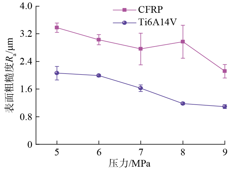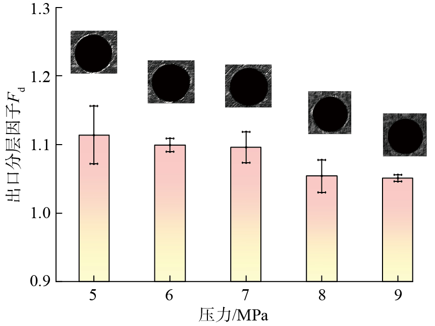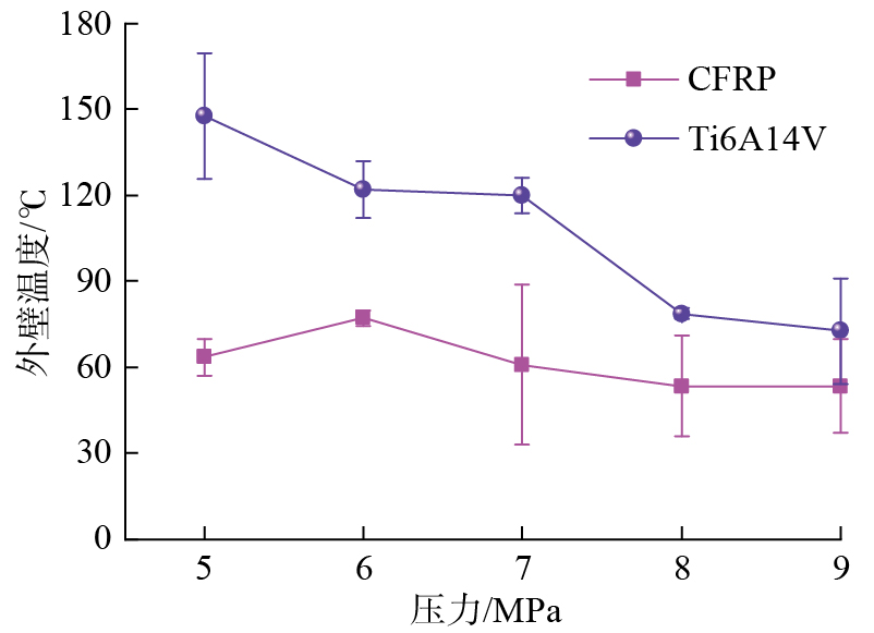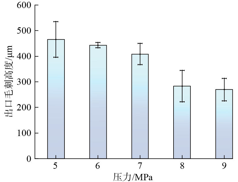 Ti6Al4V的出口毛刺是金属在钻削轴向力作用下的塑性变形,导致材料断裂和被压碎,致使出口处产生环状和尖角等不规则多余部分[ XU J Y, JI M, CHEN M, et al. Experimental investigation on drilling machinability and hole quality of CFRP/Ti6Al4V stacks under different cooling conditions[J]. The International Journal of Advanced Manufacturing Technology, 2020, 109(5): 1527–1539. 8]。降低钻削温度可以减少Ti6Al4V材料的塑性变形,避免叠层结构钻削出口毛刺过高的问题。CO2压力对Ti6Al4V出口毛刺高度的影响如图17所示,当CO2压力从5 MPa增至9 MPa后,Ti6Al4V出口毛刺高度从465.6 μm降至269.85 μm,降幅为42.04%。通过增加CO2压力,提高系统射流后的相变吸热能力,增强油滴雾化后的润滑能力,基于ScCO2的CMQL工艺降低了叠层结构的钻削温度,有效减少了Ti6Al4V的出口毛刺高度。此外,系统压力从7 MPa增至8 MPa时对应的毛刺高度降幅远高于8 MPa增至9 MPa时的毛刺高度降幅,说明改变CO2状态,增强其相变换热过程,对降低Ti6Al4V出口毛刺高度的影响更显著。当CO2压力从8 MPa增至9 MPa时,输出射流温度及钻削外壁温度均无明显变化(图11和15),两种压力下的Ti6Al4V出口毛刺高度相当。
