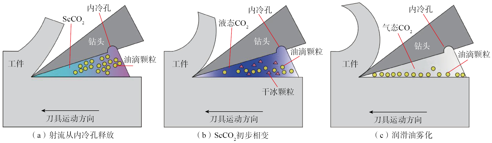 近年来,低温加工技术由于换热能力强、绿色环保和廉价的优点,得到了国内外研究人员的广泛关注,主要包括液氮(Liquid nitrogen,LN2)和CO2(Liquid carbon dioxide(LCO2)及Supercritical carbon dioxide(ScCO2))等。Iqbal等[ IQBAL A, ZHAO G L, ZAINI J, et al. CFRP drilling under throttle and evaporative cryogenic cooling and micro-lubrication[J]. Composite Structures, 2021, 267: 113916. 11]进行了MQL、蒸发式LN2和节流式压缩CO2 3种冷却润滑条件下的CFRP钻削试验,发现MQL条件下的钻削有效地减少了切削区域的摩擦和磨损效应,从而降低了轴向力、刀具磨损、比切削能耗和共工艺成本;节流式压缩CO2的有效降温获得了更好的表面光洁度和孔尺寸精度,并抑制了分层和纤维磨损;LN2极低的温度使得轴向力和比切削能量增加,并导致了孔的几何尺寸出现轻微偏差。Sorbo等[ SORBO N W, DIONNE J J. Dry drilling of stackup composite: Benefits of CO2 cooling[J]. SAE International Journal of Aerospace, 2014, 7(1): 156–163. 12]使用LCO2内冷的方式进行了CFRP/Ti6Al4V叠层结构钻削试验,结果表明,相比于干切削加工,LCO2条件下钻削Ti6Al4V和CFRP层的温度分别控制在35 ℃和20 ℃以下,减少了高温对CFRP树脂基体的热损伤,孔径一致性变好,孔壁光洁度得到了提高,钻削CFRP层时刀具寿命延长10%~20%,钻削Ti6Al4V时刀具寿命提高2~3倍,且加工完成后无需清洗。LN2的冷却温度过低,可低至–196 ℃,易使刀具材料发生严重的热疲劳失效[ JEROLD B D, KUMAR M P. The influence of cryogenic coolants in machining of Ti–6Al–4V[J]. Journal of Manufacturing Science and Engineering, 2013, 135(3): 031005. 13]。此外,采用喷嘴进行LN2和LCO2高压喷射的冷却方法则需要大量的冷却剂。