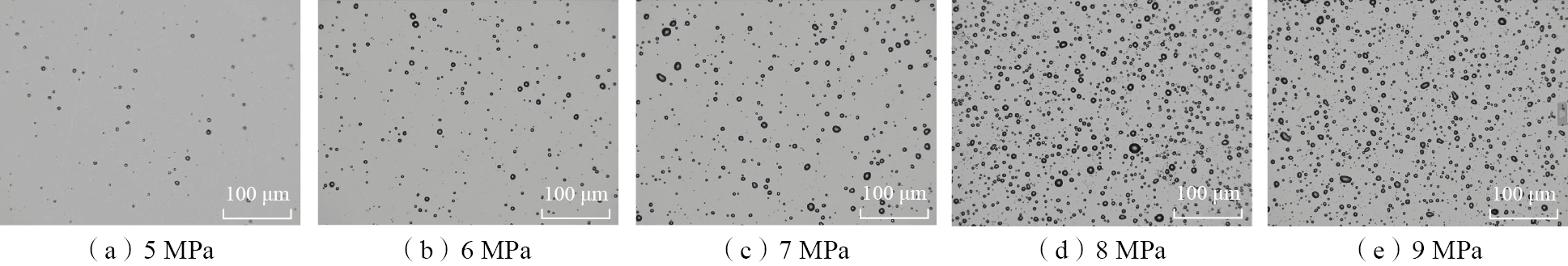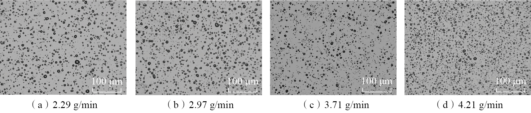 MQL的雾化效果直接影响其润滑能力。一般认为,当MQL雾化油滴颗粒直径小且尺寸均匀时,可以在加工时产生较好的润滑效果[ ISKANDAR Y, TENDOLKAR A, ATTIA M H, et al. Flow visualization and characterization for optimized MQL machining of composites[J]. CIRP Annals, 2014, 63(1): 77–80. 18]。气态、液态及超临界态CO2对润滑油的溶解能力存在差异,影响CMQL的雾化效果;同时,不同状态下的CO2从喷嘴释放后,相变吸热能力也不同。为研究CMQL雾化及冷却能力,分别探究了不同CO2压力及不同润滑油流量下的输出射流温度和雾化油滴的颗粒分布情况,测试使用的润滑油流量分别为2.29 g/min、2.97 g/min、3.71 g/min、4.21 g/min,CO2压力为5 MPa、6 MPa、7 MPa、8 MPa和9 MPa,使用的润滑油为AccuLube LB2000润滑油。为测试CMQL系统的雾化能力,将喷嘴固定在立式升降台铣床B1–400K机床的主轴处,在喷嘴下方150 mm处放置硅片承载油滴颗粒,雾化性能测试工装如图4(a)所示,试验时,喷嘴与硅片的横向相对移动速度为30 mm/s。为避免试验误差对油滴颗粒分布统计的影响,相同压力下的雾化性能测试3次。使用直径0.8 mm的喷嘴作为CMQL冷却润滑系统测试的输出装置,并使用K型热电偶测量15 mm处的射流温度,以比较不同CO2状态下的冷却性能,CQML冷却性能的测试工装如图4(b)所示。