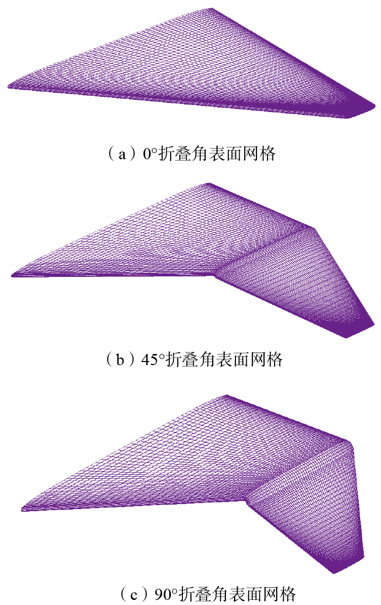 结合现有的高超声速飞行器气动布局方案,飞行器外形方案初步构建过程中,优先考虑了飞行器宽速域飞行的应用背景,通过机翼折叠的方式将不同飞行环境条件下各自具备性能优势的外形进行结合,使之同时具备高、低速飞行器的外形特点[ GONG C, MA B F. Aerodynamic evaluation of an unmanned aerial vehicle with variable sweep and span[J]. Proceedings of the Institution of Mechanical Engineers, Part G: Journal of Aerospace Engineering, 2019, 233(13): 4980-4997. 12],能够通过机翼折叠调节气动性能。在机体方面,飞行器采用大后掠三角翼、无平尾加双垂尾布局,机身、边条翼、大后掠三角翼高度融合;机翼部分采用了可折叠外翼设计,向下弯折的机翼能够抑制下表面高压溢流,同时减小气动阻力,对飞行器展弦比的调节能够影响飞行器横航向稳定性。外翼可以根据外部环境及任务需求调节折叠角度θ,机翼折叠影响的主要外形参数为翼展、机翼投影面积、展弦比等[ FITZMAURICE R. Boeing’s hypersonic passenger plane concept could one day get you from London to New York in 2 hours[EB/OL]. [2025-09-15]. http://www.businessinsider.com/boeing-hypersonic-passenger-plane-concept-london-to-new-york-in-two-hours-2018-6. 13]。折叠翼飞行器不同机翼折叠角状态的气动布局如图1所示。飞行器具体外形参数见表1。