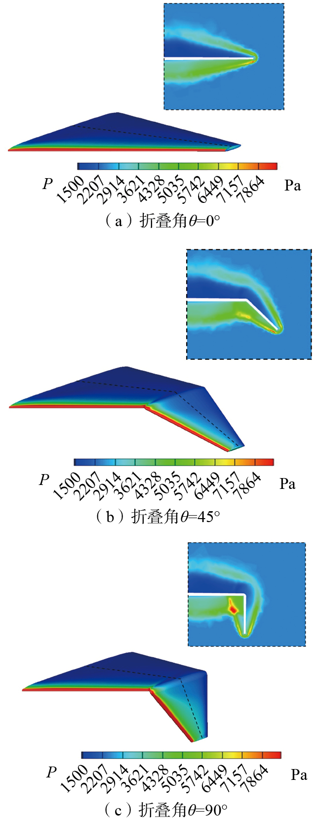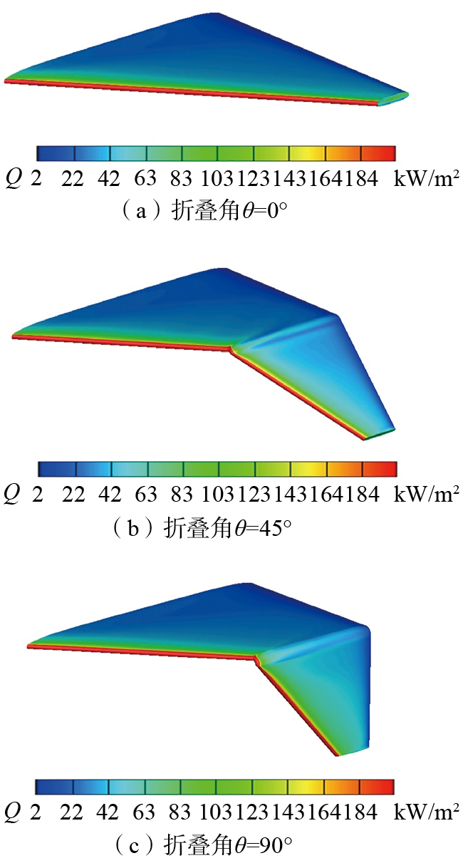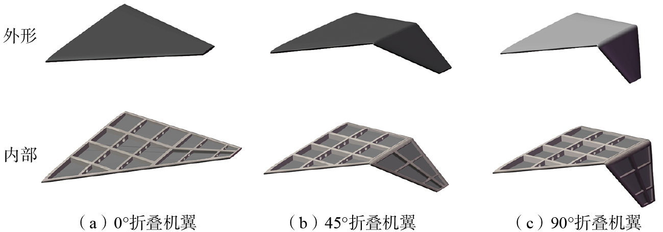 本文气动力-热-结构耦合计算主要研究流程如图8所示[ WANG J R, XIE W H, YU D, et al. Study on the multi-field coupling behavior of C/SiC composites under the combined action of the local extreme heat source and hypersonic airflow[J]. International Journal of Thermal Sciences, 2024, 200: 108952. MA N, MENG J H, LUO J Q, et al. Optimization of thermal-fluid-structure coupling for variable-span inflatable wings considering case correlation[J]. Aerospace Science and Technology, 2024, 153: 109448. 17-18]。首先,分别通过等温/绝热两种不同壁面边界条件的流场求解获取机翼表面的热流分布与表面温度分布;其次,计算得出飞行器表面的对流换热系数,绝热条件下获得的机翼壁面温度视为机翼表面流体的温度,可以用于换算各网格节点对流换热系数。将对流换热系数和温度分布作为外部载荷加载到机翼结构表面进行结构传热分析。最后,结构温度分布与表面压力分布,两者共同作为结构外部载荷进行结构响应分析。图9是不同折叠角度的机翼整体结构外形图与结构内部图。