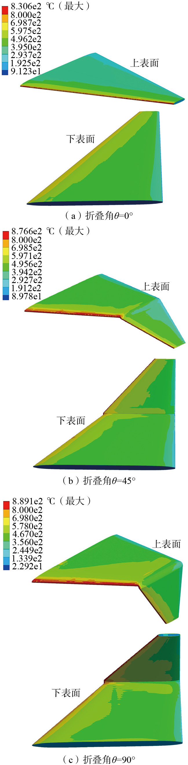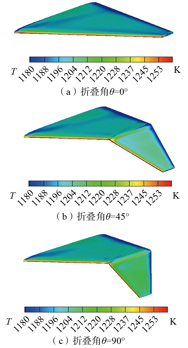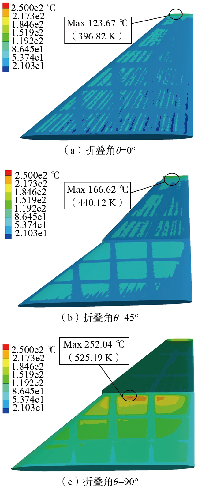 结构表面的隔热材料具有导热率较小而比热较高的属性特征,能够吸收大部分热量进而对机翼内部结构进行有效保护,在现有的气动载荷条件下结构温度最高值为机翼呈90°折叠角时的889.1 ℃,通过文献[ 闫然. 高超声速机翼热结构设计方法研究[D]. 南京: 南京航空航天大学, 2019.YAN Ran. Research on the design method of hypersonic wing thermal structure[D]. Nanjing: Nanjing University of Aeronautics and Astronautics, 2019. 20]中的数据可知本节选用的隔热材料能够承受的最高温度在1300 ℃以上。因此可以获得如下结论,在高超声速的飞行状态下,机翼折叠所引起的前缘气动加热现象更加剧烈,折叠角增大而带来的结构温度升高幅度较小,机翼前缘等防热重点区域可以通过选用隔热材料来消除机翼折叠给结构防热带来的负面影响。