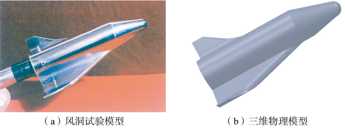图2 空天飞机风洞试验模型及三维物理模型[ 李素循. 典型外形高超声速流动特性[M]. 北京: 国防工业出版社, 2007.LI Suxun. Typical shape hypersonic flow characteristics[M]. Beijing: National Defense Industry Press, 2007. 14]