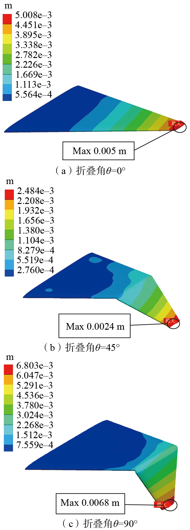 由图20可见,机翼的最大应力位置随折叠角度变化而改变,在0°和45°折叠角时,最大应力集中在翼尖处,随着折叠角度增大,最大应力的位置向机翼下表面转角附近移动,最大应力为506.1 MPa。最大应力的变化与气动载荷的分布规律一致,随着折叠角度增大,高压气流聚集在机翼下表面与外翼内侧之间,最大应力小于钛合金材料800 MPa的许用应力[ CASTELLANI M, COOPER J E, LEMMENS Y. Nonlinear static aeroelasticity of high-aspect-ratio-wing aircraft by finite element and multibody methods[J]. Journal of Aircraft, 2017, 54(2): 548-560. 21]。另外,图21给出了结构变形的分析结果,受结构自身抵抗变形能力和气动载荷分布变化影响,机翼结构变形位移随折叠角增大先减小后增大,最大变形位移为90°折叠角时6.80 mm。