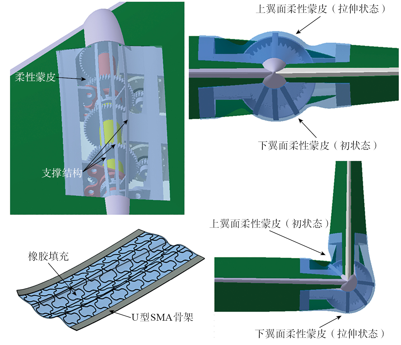 变体飞行器能够根据不同的飞行状态调整外形,以提升气动性能[ 陆宇平, 何真, 吕毅, 等. 变体飞行器技术[J]. 航空制造技术, 2008, 51(22): 26-29.LU Yuping, HE Zhen, LÜ Yi, et al. Morphing aircraft technology[J]. Aeronautical Manufacturing Technology, 2008, 51(22): 26-29. 1]。其中,能够平滑连续变形的柔性机翼是实现变体的主要形式。与普通固定翼仅针对在特定工况下优化飞行性能不同,柔性机翼可以通过改变气动外形,确保不同工况下的气动效率和机动性能达到最佳。其优势[ THILL C, ETCHES J, BOND I, et al. Morphing skins[J]. The Aeronautical Journal, 2008, 112(1129): 117-139. 2]包括:(1)提升飞行性能,扩大飞行包线;(2)以柔性机翼替代传统的飞行控制面,增强隐身性;(3)减小飞行阻力,增加航程;(4)减少振动和噪声,提高飞行舒适度与安全性。