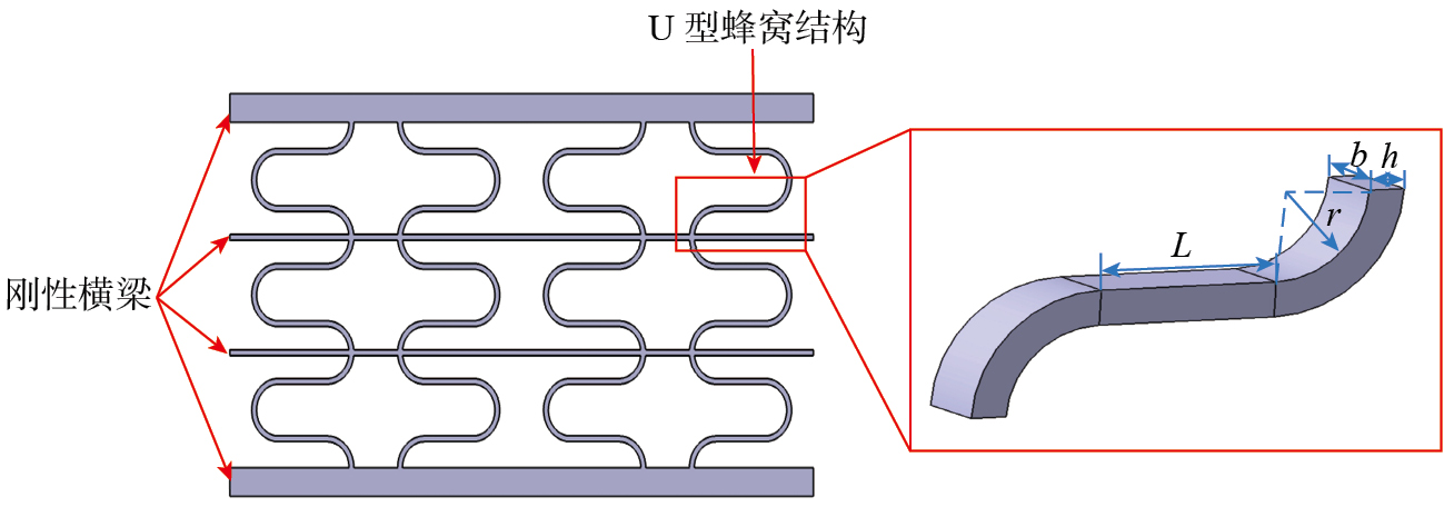 在承受面外法向气动载荷时,蒙皮通过U型蜂窝骨架将载荷传递至蒙皮支撑结构,并保证其在面内方向具有较大的变形能力,以满足折叠过程中的柔性蒙皮变形要求。前期研究表明[ 刘卫东. 变形机翼关键技术的研究[D]. 南京: 南京航空航天大学, 2014.LIU Weidong. Research on key technology of morphing wing[D]. Nanjing: Nanjing University of Aeronautics and Astronautics, 2014. 10],U型蜂窝骨架的承载能力与大变形能力之间存在矛盾:即承载能力的增强通常会导致大变形能力的减弱,反之亦然。作为决定柔性蒙皮整体性能的关键结构,设计U型蜂窝骨架时,如何在保障特定气动载荷承载能力的同时满足面内变形要求,成为研究中的重要问题。因此,本文将建立U型蜂窝骨架的力学本构模型,并基于此模型对其几何尺寸进行优化设计,以满足柔性蒙皮特定应用场景的需求。