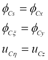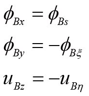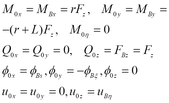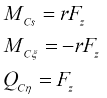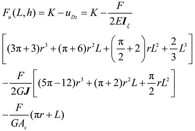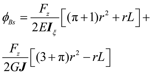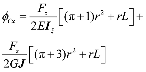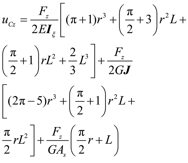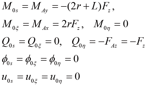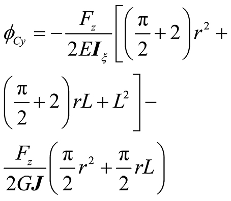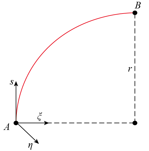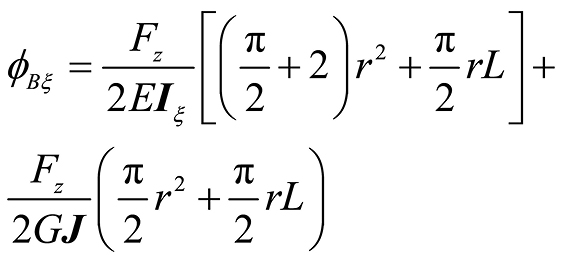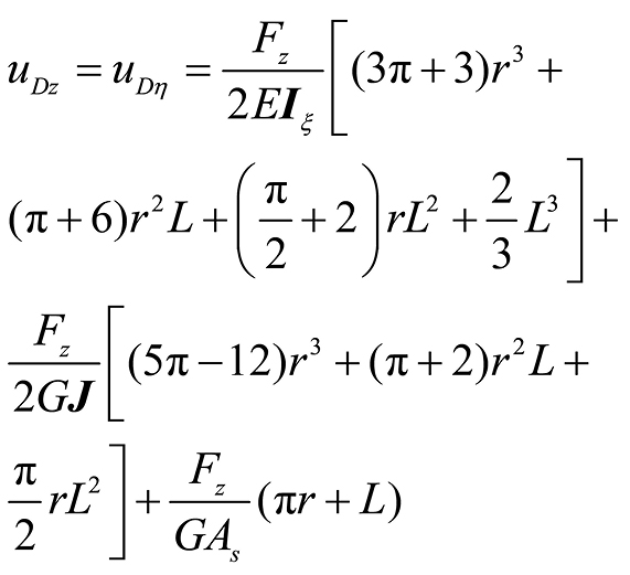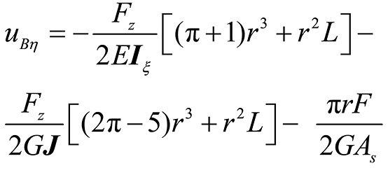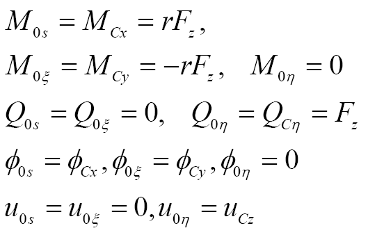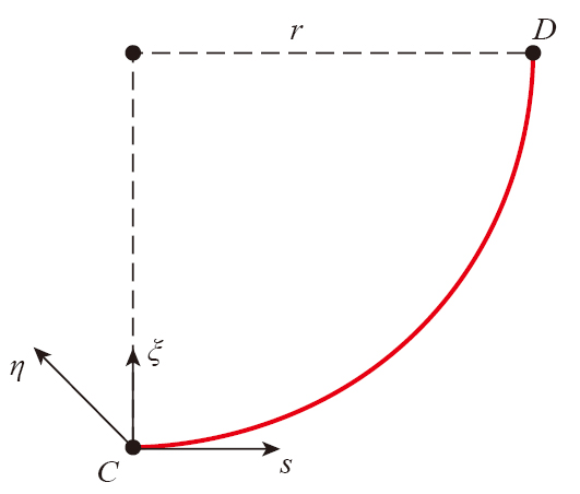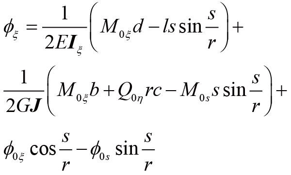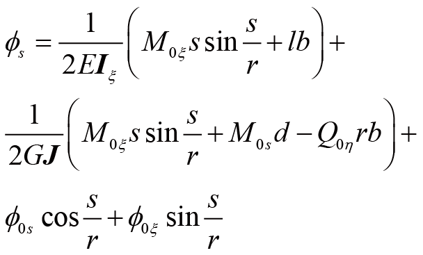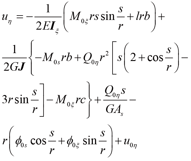 曲梁在不考虑翘曲,受集中力载荷的情况下,坐标s处的转角ϕs、ϕξ与挠度uη的计算公式[ 朱莉莉, 王广欣. 空间曲线梁的力学分析与研究[M]. 北京: 北京理工大学出版社, 2020.ZHU Lili, WANG Guangxin. Mechanical analysis and research of spaciall curved beams[M]. Beijing: Beijing Institute of Technology Press, 2020. 18]为
