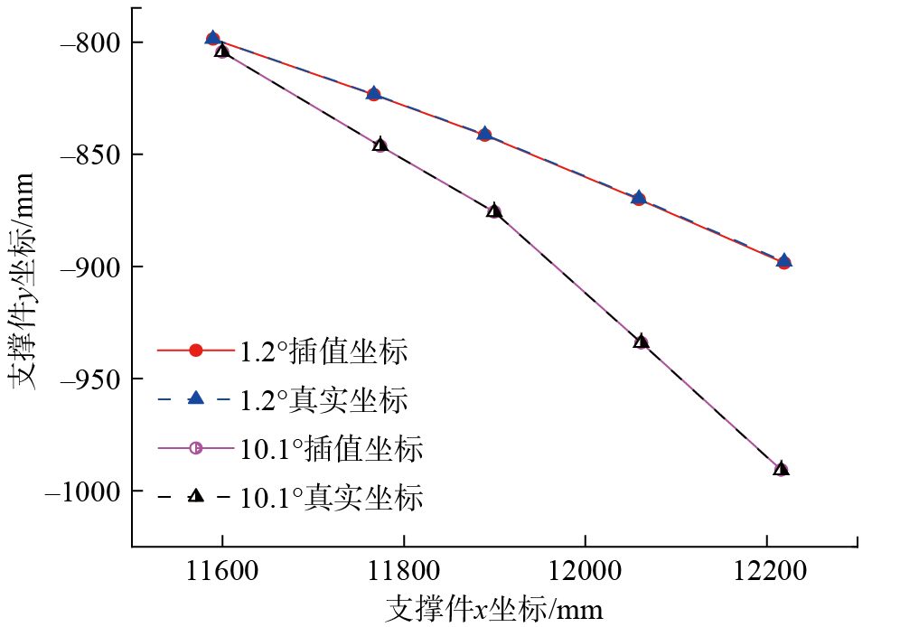 可以看出,各支撑件的运动轨迹较为规律,通过对某一支撑件在不同偏度下的位置坐标进行插值,可以估算出任意偏度下该支撑件的坐标。为验证插值的准确性,提取偏度取值为0,3.2,5.2,7.9,12.6时各支撑件坐标进行3次样条插值,利用偏度取值为1.2和10.1时支撑件的真实坐标数据进行验证。将真实坐标数据和插值得到的坐标数据进行对比,如图10所示,可知插值精度较高。根据所得的3次样条函数,针对给定的下偏角度值,可以计算出该偏度下各个关键点坐标。