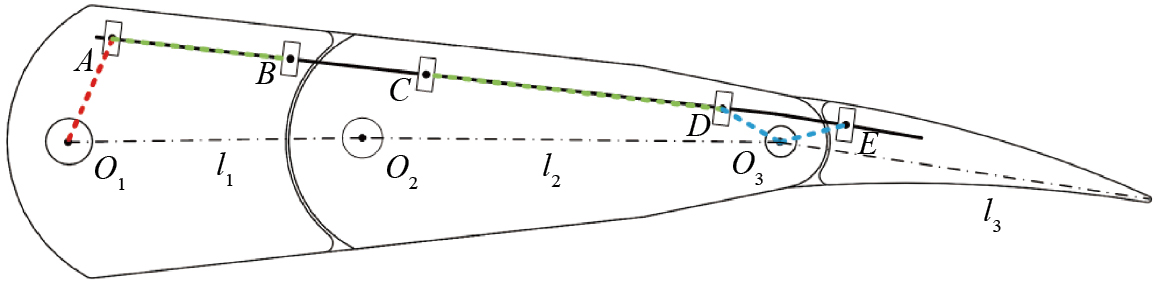在已知5个关键点初始坐标和当前坐标的条件下,结合后缘翼肋的结构尺寸信息可计算出各个关节当前的转动角度。图11为机翼后缘翼肋主体结构初始状态下各支撑件与各关节相对位置的示意图,其中O1、O2、O3分别为关节1~3的中心,A、B、C、D、E分别为支撑件1~5的坐标点。