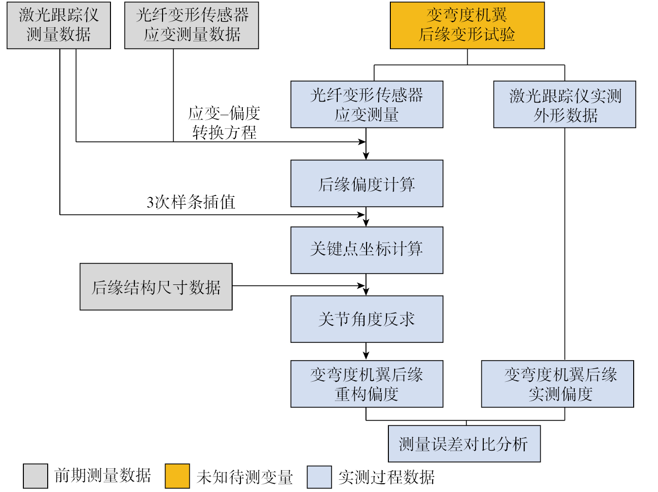 后缘形状重构算法试验验证流程如图14所示。在搭建的变弯度机翼后缘变形试验中,通过光纤变形传感器测量应变数据,通过预先激光跟踪仪测试数据和光纤变形传感器应变数据得到应变-偏度转换方程,计算得到试验中的后缘偏度,结合前文中激光跟踪仪得到的3次样条插值结果,可以计算出关键点坐标。进而结合后缘结构的尺寸数据,逆向求解得到后缘翼肋3个关节的旋转角度,实现后缘变形的重构。基于关节角度正向求解出后缘的偏度,与激光跟踪仪实测的机翼后缘形状所得的偏度进行测量误差对比分析。