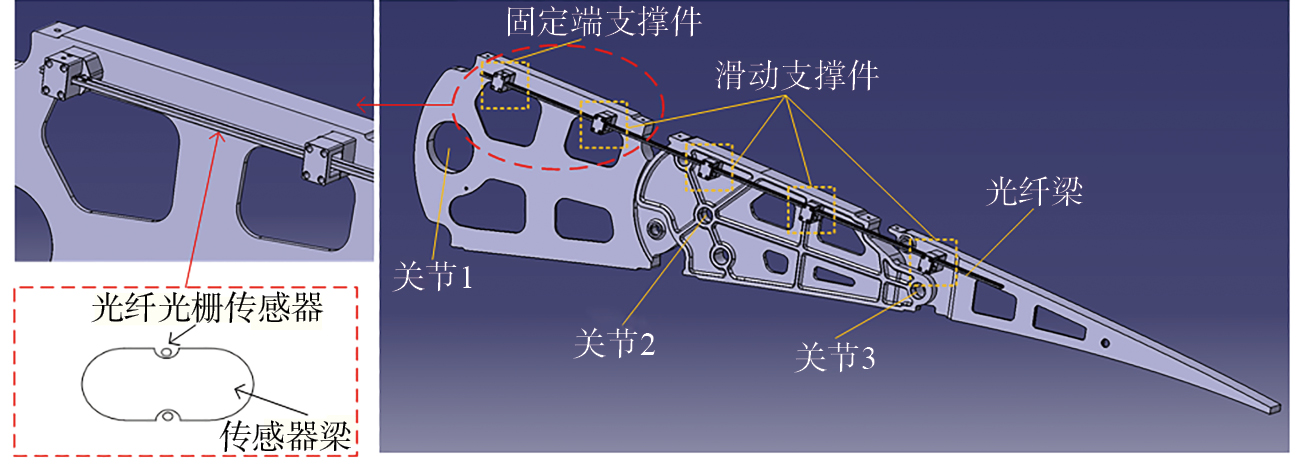 对于指节式变弯度机翼后缘,其结构表面变形由3段指节的刚体位移和相邻指节连接处的柔性蒙皮变形构成,难以仅通过蒙皮表面应变建立应变与结构整体变形的关系,导致逆有限元法等理论方法难以适用,因此采用间接测量的方式,将结构的整体变形传递到一根柔性梁上,由柔性梁的变形来反映整体变形情况。根据该测量原理,为使用尽可能少的光纤光栅实现对后缘变形情况的感知,设计一种变形传感器,将一根柔性梁上下表面对称刻槽,以安装两根光纤光栅的方式形成光纤梁,变形传感器的光纤梁截面示意如图3中左下图红色虚线框所示。再通过几个支撑结构将光纤梁固定于机翼后缘的翼肋上,变形传感器在翼肋上的安装布局设计示意如图3所示。因光纤梁与机翼后缘之间的变形传递通过支撑结构来实现,支撑件的结构设计关系到变形测量的准确性,因此将各支撑件的中心视为关键点,基于关键点坐标开展形状重构算法的研究。考虑到后缘翼肋的主体结构可以视为串联的3根连杆,各连杆之间通过转动关节相连,光纤梁布置在翼肋侧面靠近上蒙皮的位置,沿光纤梁方向靠近关节1处布置固定端支撑件以保持光纤梁的一端固定,在关节2和3两侧分别布置滑动支撑件,各支撑件之间的距离相近,使光纤梁的变形均匀,可反映出后缘真实变形情况。完成变形传感器的安装后,通过激光跟踪仪测量变形过程中变弯度机翼后缘的实际外形变化数据(即下偏角度),并建立光纤光栅测得的应变数据与下偏角度之间的映射关系,实现对后缘变形程度的测量。