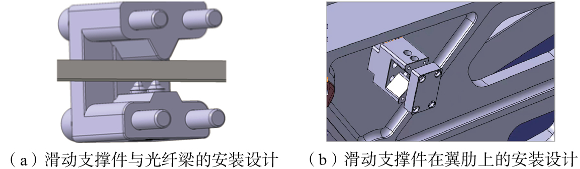光纤变形传感器包括固定端支撑件、滑动支撑件、光纤梁等,其中滑动支撑件为关键部件,需允许光纤梁在弯曲过程中能够沿轴向自由滑动,并在其他方向上约束其运动以保证变形测量精度,因此依据此要求提出弹簧顶珠方案,弹簧顶珠在光纤梁顶部用弧面产生线接触;在底部采用两个弹簧顶珠与光纤梁产生点接触,顶珠可在光纤梁和弹簧的作用下在一定范围内上下移动,实现光纤梁的快速安装和自由滑动,具有较好的配合效果,且可重复使用。滑动支撑件结构设计及其在翼肋上的安装示意如图4所示。