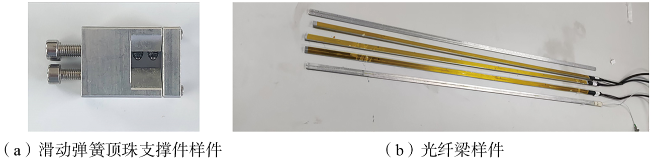 光纤梁和支撑结构均采用轻质铝合金材料,光纤梁尺寸为长750 mm、宽10 mm、厚3 mm,上下两面刻制半圆弧槽,圆弧半径为1 mm,用于安装光纤光栅传感器。光纤光栅采用直径为155 μm、耐300 ℃的聚酰亚胺涂覆光纤,传感器制备首先采用快干胶带对光纤光栅进行预定位,并在光纤一侧利用砝码进行预拉伸,以保证光纤光栅位置的精确固定,之后在光纤光栅处填充环氧型胶黏剂,光栅之间的传输光纤填充硅胶,常温固化24 h,光纤出口处用特氟龙套管和热缩管保护。滑动弹簧顶珠支撑结构和光纤梁实物图如图5所示,部分光纤梁因表面贴了一层聚酰亚胺保护膜显示为黄色。