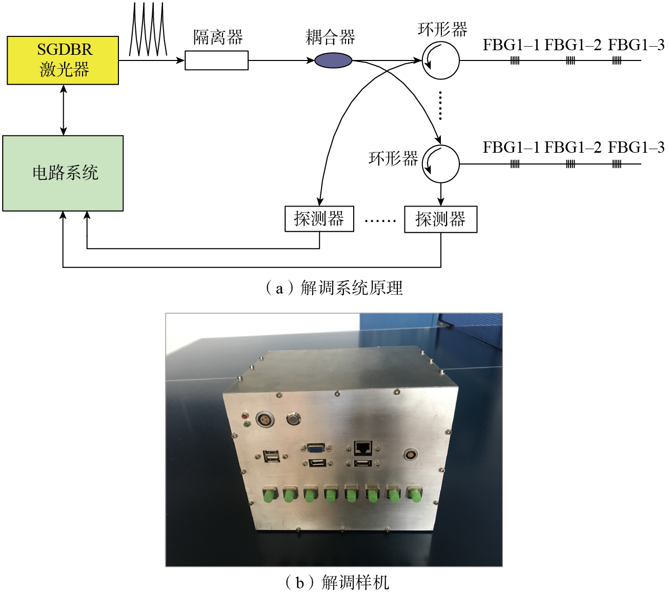 采用基于SGDBR激光器解调系统实时获取光纤光栅传感器的中心波长,解调系统原理及自研解调样机如图6所示,电路系统控制SGDBR连续输出指定波长的窄带脉冲光信号,光信号经过耦合器进行分路,可以同时对多通道光纤光栅传感器进行测试,每个通道的光信号经过环形器后返回到光电探测器,电路系统对光电转换后的信号进行解调处理,最终得到被测光纤光栅传感器的中心波长值。