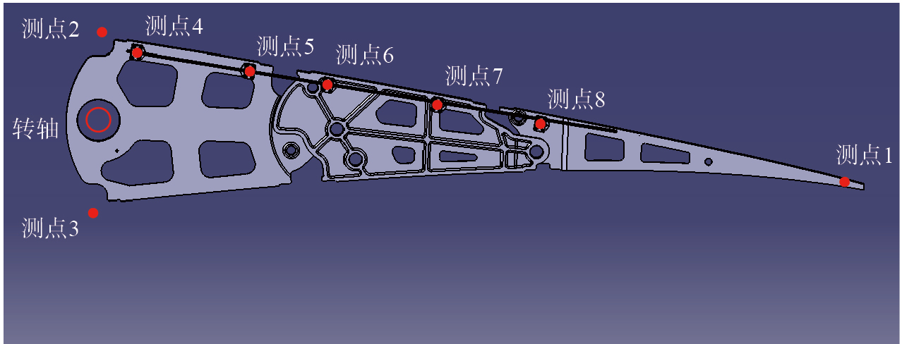 激光跟踪仪测点位置如图8所示,测点1位于后缘末端,转轴位置为测点2与3坐标中点,基于3个测点的坐标可以计算出后缘偏度。测点4~8为5个支撑件上的测点。