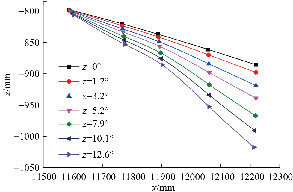 首先,将光纤梁的5个支撑件作为形状重构的关键点,每个支撑件对应的都是空间坐标,由于预设条件为后缘不偏转,属于二维变形,每个支撑件仅有x、y的坐标值,z为利用激光跟踪仪测量的后缘偏度,对其[0°,12.6°]区间中7个偏度下的5支撑件坐标3次样条插值,如图9所示。