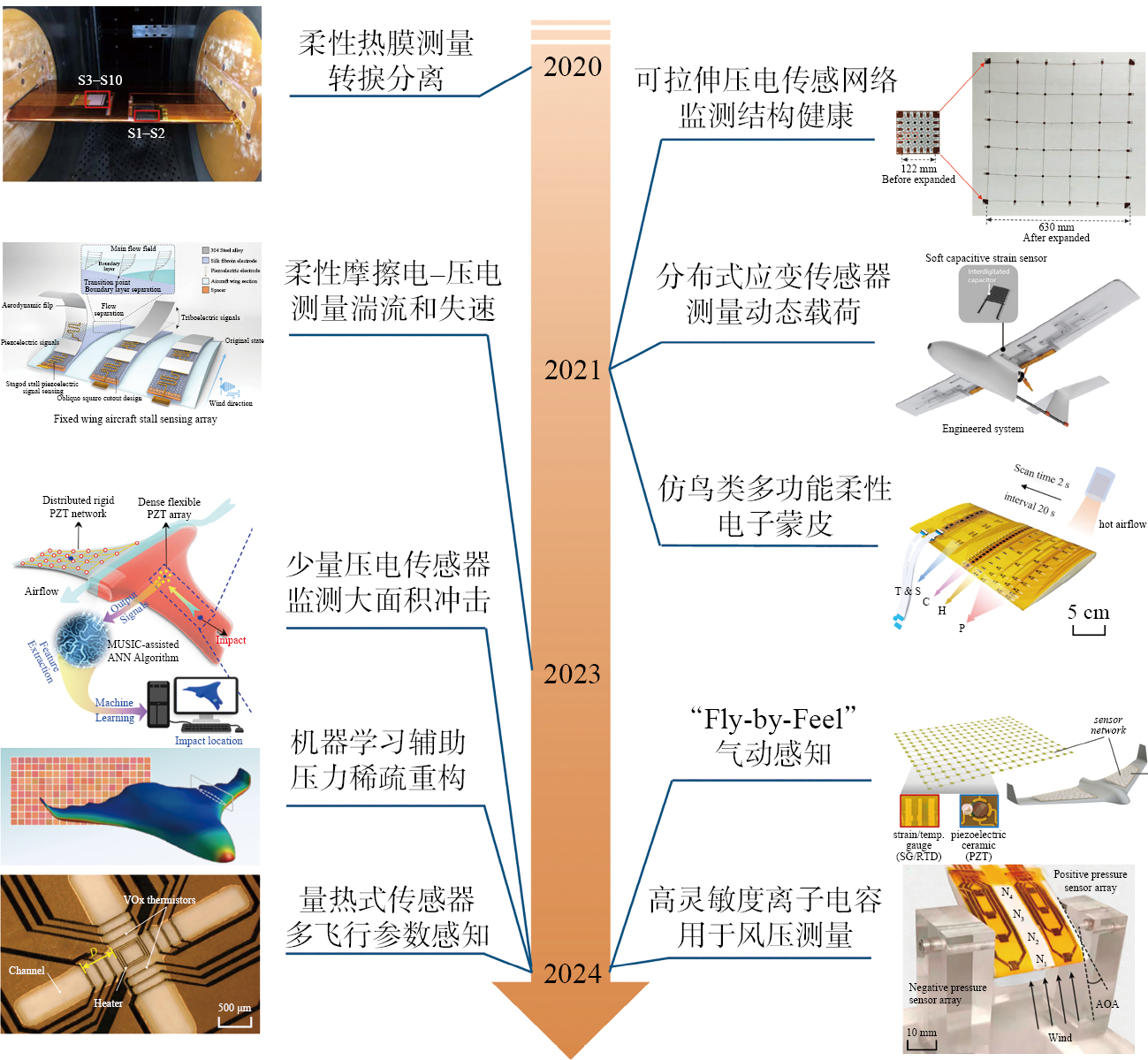 图2 基于柔性电子蒙皮的传感器飞行器的重要进展[ XIONG W N, ZHU C, GUO D L, et al. Bio-inspired, intelligent flexible sensing skin for multifunctional flying perception[J]. Nano Energy, 2021, 90: 106550. 17, SUN B Y, MA B H, WANG P B, et al. High sensitive flexible hot-film sensor for measurement of unsteady boundary layer flow[J]. Smart Materials and Structures, 2020, 29(3): 035023. WANG Y, QIU L, LUO Y J, et al. A stretchable and large-scale guided wave sensor network for aircraft smart skin of structural health monitoring[J]. Structural Health Monitoring, 2021, 20(3): 861-876. SHIN H S, OTT Z, BEUKEN L G, et al. Bio-inspired large-area soft sensing skins to measure UAV wing deformation in flight[J]. Advanced Functional Materials, 2021, 31(23): 2100679. XU Z J, CAO L N Y, LI C Y, et al. Digital mapping of surface turbulence status and aerodynamic stall on wings of a flying aircraft[J]. Nature Communications, 2023, 14: 2792. ZHU C, XU Z Y, HOU C, et al. Flexible, monolithic piezoelectric sensors for large-area structural impact monitoring via MUSIC-assisted machine learning[J]. Structural Health Monitoring, 2024, 23(1): 121-136. ZHAO Q Y, HUANG J, GUO Y X, et al. Machine learning-assisted sparse observation assimilation for real-time aerodynamic field perception[J]. Science China Technological Sciences, 2024, 67(5): 1458-1469. TOPAC T, GRAY C, CHANG F K. Fly-by-feel: Learning aerodynamics from multimodal wing mechanics[C]//AIAA SCITECH 2024 Forum. Orlando: AIAA, 2024. GONG Z, DI W C, JIANG Y G, et al. Flexible calorimetric flow sensor with unprecedented sensitivity and directional resolution for multiple flight parameter detection[J]. Nature Communications, 2024, 15: 3091. WANG J X, WEI X Y, SHI J L, et al. High-resolution flexible iontronic skins for both negative and positive pressure measurement in room temperature wind tunnel applications[J]. Nature Communications, 2024, 15: 7094. 23-31]