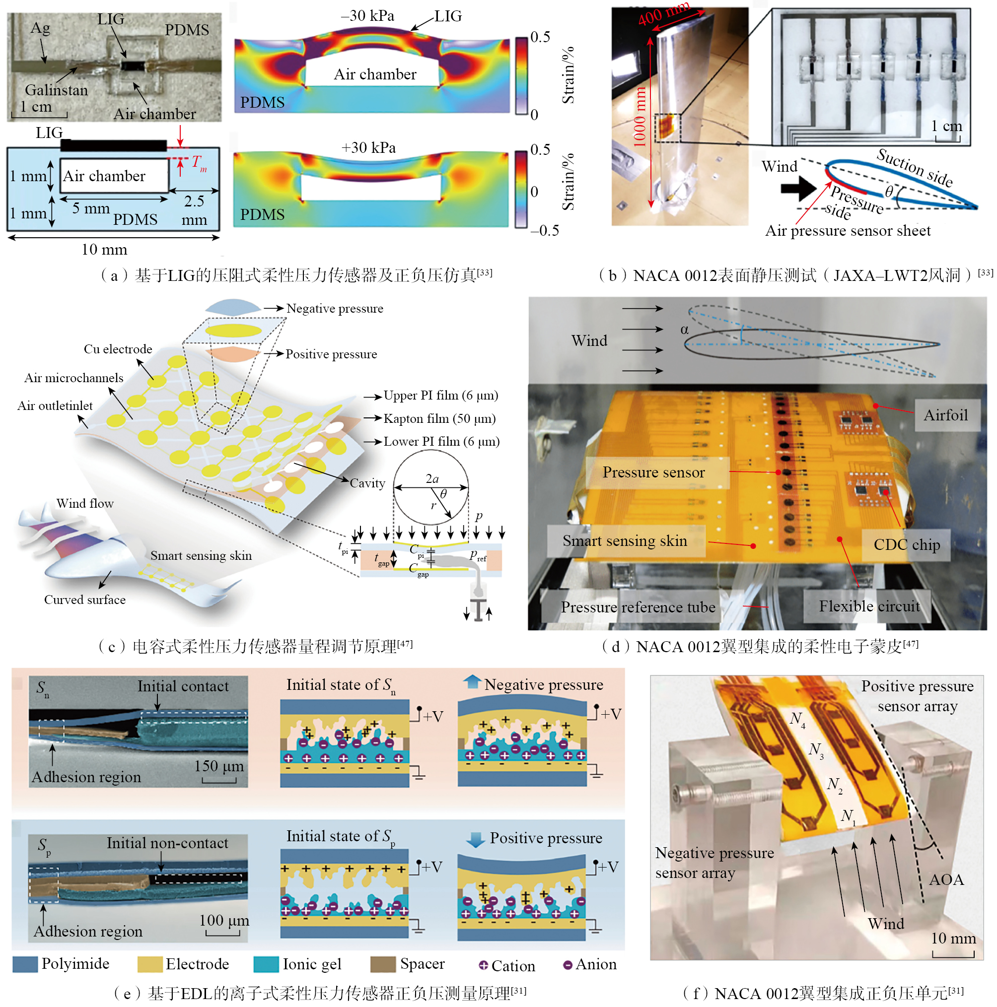 目前,大多数柔性压力传感器仅能用于接触式压力测量,而航空航天领域的壁面压力需要同时具备正负压测量能力(从近真空的负压到高动压区的正压区),这对柔性壁面压力传感器提出了新的挑战,需要具备复杂的多层膜结构和严格密封参考压力腔。Xuan等[ XUAN Y, UCHIYAMA T, URA H, et al. Flexible integrated air pressure sensors for monitoring positive and negative pressure distribution[J]. ACS Applied Materials & Interfaces, 2024, 16(40): 54215-54223. 33]利用激光诱导石墨烯(Laser-induced graphene,LIG)和PDMS薄膜空腔结构,如图3(a)所示,成功开发了一种基于应变电阻变化原理的柔性气压传感器,实现了正压和负压分布的实时监测。测试正负压(-30~30 kPa)下电阻变化,灵敏度分别为负压10.2%/kPa,正压-0.55%/kPa。分别通过日本新千岁机场到羽田机场的飞行气压测试,以及NACA 0012机翼集成在日本JAXA-LWT2低速风洞试验(图3(b)[ XUAN Y, UCHIYAMA T, URA H, et al. Flexible integrated air pressure sensors for monitoring positive and negative pressure distribution[J]. ACS Applied Materials & Interfaces, 2024, 16(40): 54215-54223. 33])验证了传感器压力测量的准确性。对于此类密封的参考压力腔,Xiong等[ XIONG W N, GUO D L, YANG Z X, et al. Conformable, programmable and step-linear sensor array for large-range wind pressure measurement on curved surface[J]. Science China Technological Sciences, 2020, 63(10): 2073-2081. 47]提出了可通过调节参考压力实现了量程的可编程性,解决了单一传感器难以兼顾宽量程和高灵敏度的矛盾,并在NACA 0012翼型上的风洞测试验证了柔性传感器阵列在复杂曲面压力测量中的可行性,如图3(c)和(d)所示。