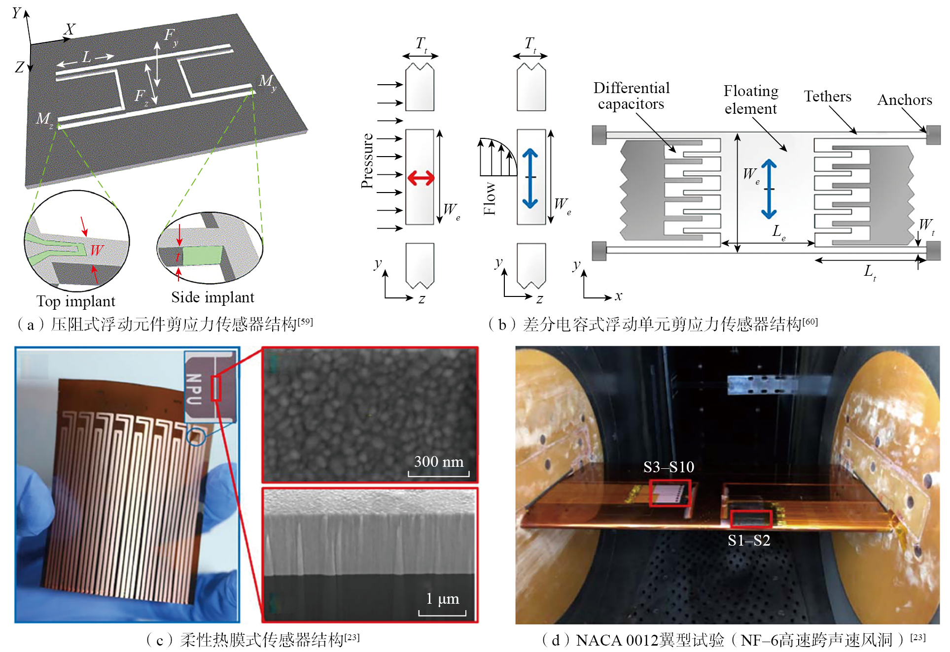浮动元件法的核心思想是利用一个与周围壁面齐平安装的可移动微小平台,直接感受流体施加在其表面上的切向力(剪应力)。这个浮动元件通过柔性梁、悬臂或系链悬挂在固定的基底上。当流体流过传感器表面时,作用在浮动元件上的总剪切力会导致元件发生微小的位移[ SCHMIDT M A, HOWE R T, SENTURIA S D, et al. Design and calibration of a microfabricated floating-element shear-stress sensor[J]. IEEE Transactions on Electron Devices, 1988, 35(6): 750-757. SHAJII J, NG K Y, SCHMIDT M A. A microfabricated floating-element shear stress sensor using wafer-bonding technology[J]. Journal of Microelectromechanical Systems, 1992, 1(2): 89-94. 57-58]。典型的浮动元件由悬臂梁和应变片构成,如图4(a)所示[ BARLIAN A A, PARK S J, MUKUNDAN V, et al. Design and characterization of microfabricated piezoresistive floating element-based shear stress sensors[J]. Sensors and Actuators A: Physical, 2007, 134(1): 77-87. 59],通过侧壁和顶部植入的压阻元件分别测量平面内剪切力和平面外法向力[ BARLIAN A A, PARK S J, MUKUNDAN V, et al. Design and characterization of microfabricated piezoresistive floating element-based shear stress sensors[J]. Sensors and Actuators A: Physical, 2007, 134(1): 77-87. 59]。此外,流动中的压力梯度也会造成一定的误差,通过差分电容可有效抑制压力的干扰。如图4(b)所示[ CHANDRASEKHARAN V, SELLS J, MELOY J, et al. A microscale differential capacitive direct wall-shear-stress sensor[J]. Journal of Microelectromechanical Systems, 2011, 20(3): 622-635. 60],通过两个叉指电容差分,可以放大剪应力信号而抑制共模的压力信号,压力抑制比达64 dB,从而显著降低了噪声(约)。