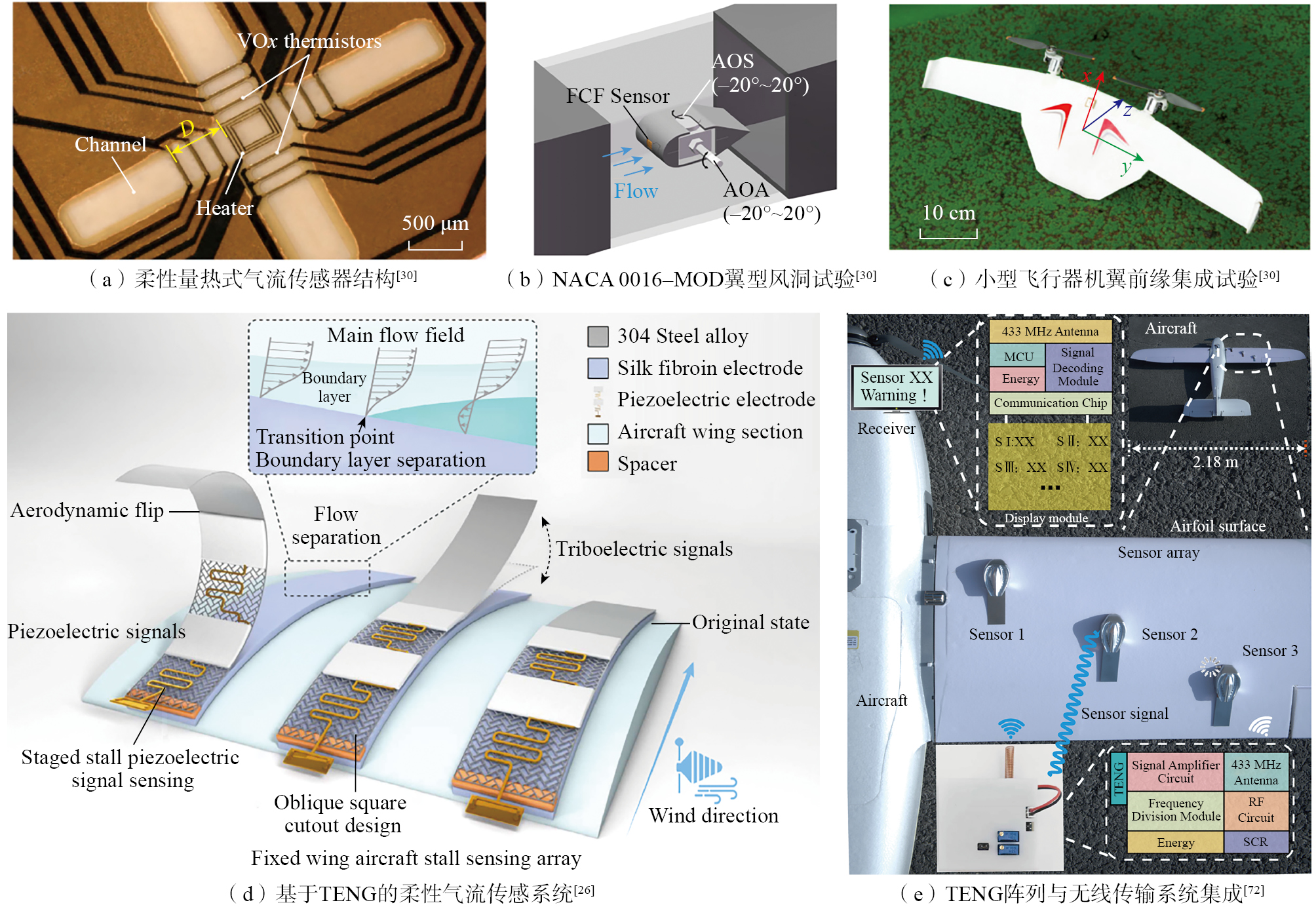 另一种极具潜力的柔性气流传感技术起源于传统的丝线法[ TAO J L, YU X. Hair flow sensors: From bio-inspiration to bio-mimicking—A review[J]. Smart Materials and Structures, 2012, 21(11): 113001. 71],将传统的丝线法(用于流动显示)与摩擦纳米发电机(Triboelectric nanogenerator,TENG)相结合[ XU Z J, CAO L N Y, LI C Y, et al. Digital mapping of surface turbulence status and aerodynamic stall on wings of a flying aircraft[J]. Nature Communications, 2023, 14: 2792. 26, SHENG H R, CAO L N Y, SHANG Y R, et al. Conformal self-powered high signal-to-noise ratio biomimetic in situ aircraft surface turbulence mapping system[J]. Nano Energy, 2025, 136: 110694. 72]。TENG利用摩擦起电和静电感应效应将机械能(如气流引起的振动或摩擦)转化为电能[ WANG Z L. Triboelectric nanogenerator (TENG)—Sparking an energy and sensor revolution[J]. Advanced Energy Materials, 2020, 10(17): 2000137. CHEN J, WANG Z L. Reviving vibration energy harvesting and self-powered sensing by a triboelectric nanogenerator[J]. Joule, 2017, 1(3): 480-521. FAN F R, TIAN Z Q, WANG Z L. Flexible triboelectric generator[J]. Nano Energy, 2012, 1(2): 328-334. 73-75]。在气流传感方面,TENG可以设计成风车式[ LI Y, DENG H C, WU H Y, et al. Rotary wind-driven triboelectric nanogenerator for self-powered airflow temperature monitoring of industrial equipment[J]. Advanced Science, 2024, 11(13): 2307382. WANG P H, PAN L, WANG J Y, et al. An ultra-low-friction triboelectric-electromagnetic hybrid nanogenerator for rotation energy harvesting and self-powered wind speed sensor[J]. ACS Nano, 2018, 12(9): 9433-9440. 76-77]、薄膜拍打式[ ZHANG H L, YANG Y, ZHONG X D, et al. Single-electrode-based rotating triboelectric nanogenerator for harvesting energy from tires[J]. ACS Nano, 2014, 8(1): 680-689. 78]。将微小的覆盖有摩擦电材料的丝线固定在飞机表面,丝线在气流作用下会摆动或振动。丝线与下方电极或其他摩擦层之间的接触-分离或相对滑动会产生摩擦电信号。通过分析TENG信号的特征(如信号幅值、频率、波形等),可以判断局部气流状态,如层流(信号平稳或无信号)、湍流(信号波动剧烈)、分离流(丝线剧烈拍打或指向异常)甚至失速状态。图5(d)展示了Xu等[ XU Z J, CAO L N Y, LI C Y, et al. Digital mapping of surface turbulence status and aerodynamic stall on wings of a flying aircraft[J]. Nature Communications, 2023, 14: 2792. 26]的固定翼失速传感阵列,该研究开创性地将TENG阵列首次应用于真实飞行工况,在Prandtl-500回流风洞中使用NACA0012翼型模型进行风洞试验,并在Cessna 182模型飞机和真实Cessna C172S载人飞机上进行实地测试,成功实现了机翼表面湍流演化过程的数字化可视化,并基于湍流信号特征准确预测了失速。在此基础上,Sheng等[ SHENG H R, CAO L N Y, SHANG Y R, et al. Conformal self-powered high signal-to-noise ratio biomimetic in situ aircraft surface turbulence mapping system[J]. Nano Energy, 2025, 136: 110694. 72]进一步优化了该系统,结合仿生设计(涡流发生器)和优化的丝素蛋白材料,不仅能实时检测失速状态,还能通过控制气流延缓失速发生。通过433 MHz无线传输设备进一步提升了系统的实用性,确保信号实时传输至驾驶舱,展示了其作为仿生柔性电子蒙皮用于原位湍流映射的应用前景(图5(e))。