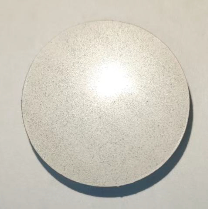样品所用喷涂基材为GH5188高温合金,机械加工成Φ25 mm×5 mm圆片。喷涂粉末底层选用商业NiCrAlY粉末(Oerlikon metco amdry 9625,USA),粉末粒径为5~50 μm;面层选用商业YSZ粉末(Oerlikon Metco 204AF,USA),粉末粒径为15~45 μm;CaF2粉末(ZrO2包覆CaF2)的粉末粒径5~120 m;Al2O3粉末(Oerlikon metco amdry 6060,USA)的粉末粒径为5~45 μm;以YSZ+6% CaF2+6% Al2O3、YSZ+12% CaF2+12% Al2O3(质量分数)的成分配比并物理混合,利用SYH-15L型三维混粉器混合30 min,记为A组、B组,烘干备用,两组样品的粉末成分如表1所示。利用APS-3000型大气等离子喷涂设备进行涂层制备,喷涂前对基体进行喷砂处理,底层与面层的工艺参数如表2所示。利用Smoothneer-6金相制样机进行表面处理,使涂层表面粗糙度Ra<0.8 μm,磨抛后涂层表面呈白色基底,分布灰黑色微粒,表面反光均匀,如图1所示。