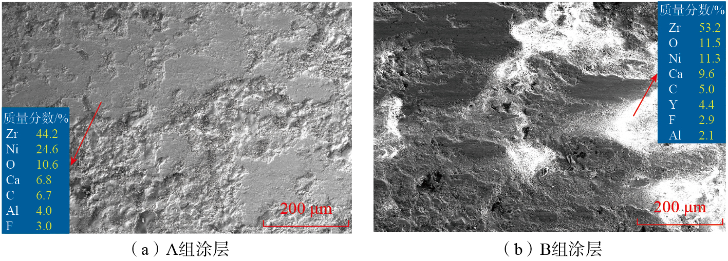 200 ℃摩擦试验后,A、B两组涂层形貌具有一定差异。两组涂层磨痕形貌如图10所示。A组涂层表面大面积被岛状摩擦层覆盖,未被覆盖处有较多磨屑;B组涂层表面被大量磨屑覆盖。根据EDS结果,摩擦层由涂层以及磨球材料共同组成,Zr元素占比为44.2%,Ni元素占比24.6%;磨屑中Zr元素占比为53.2%,Ni元素占比为11.3%,因此判断大部分磨屑来自涂层自身,涂层已受到一定破坏。在200 ℃试验后,根据EDS结果,A组涂层磨痕表面Ni元素含量为15%,B组涂层磨痕表面Ni含量为7.3%,结合磨损率数据可以判断,在200 ℃的摩擦试验过程中,A组涂层自身所受破坏较少,磨球材料涂抹到涂层上形成岛状摩擦层;B组涂层自身在摩擦过程中被破坏较多,形成大量磨屑。200 ℃摩擦试验中,由于温度升高导致涂层硬度降低,使涂层在摩擦过程中受到更大的破坏。A组涂层硬度较高,受到破坏较少,摩擦行为仍与室温相近,保持较低的摩擦系数;B组涂层硬度较低,受到较大破坏,产生大量磨屑,造成严重三体磨粒磨损。