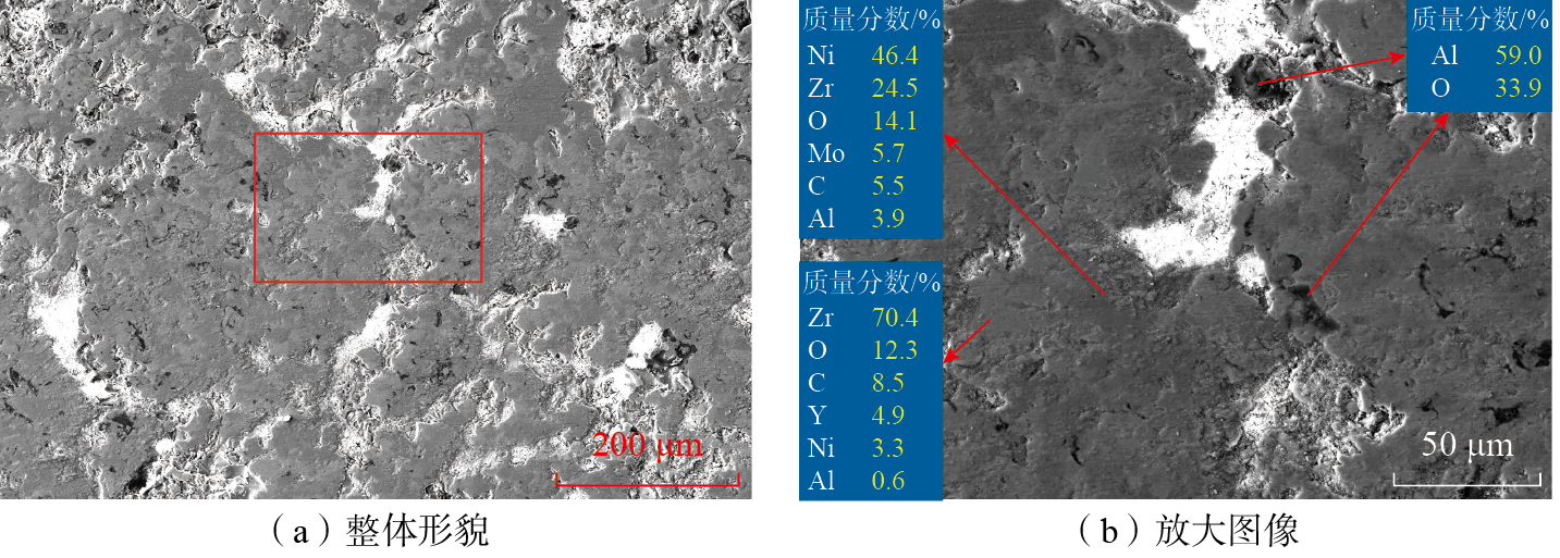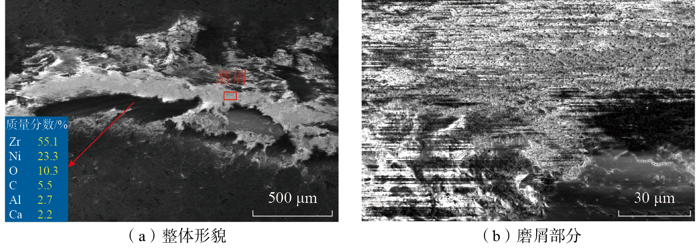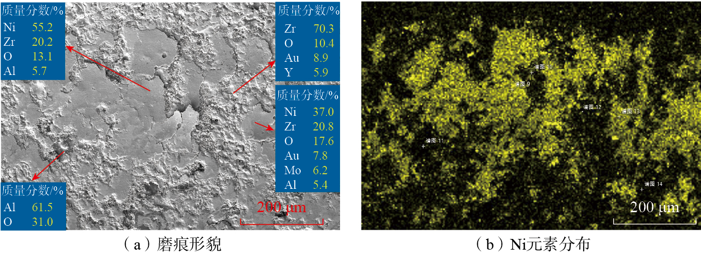 400 ℃摩擦试验后,两组涂层的磨痕形貌相差不大。A组涂层在400 ℃摩擦试验后的磨痕形貌如图11所示,磨痕表面大面积被磨屑覆盖,其余部位为岛状摩擦层。磨痕和摩擦层中均为Zr元素占比较多。400 ℃摩擦试验中,涂层硬度大幅降低,与200 ℃的B组相近。A、B组涂层在摩擦过程中被破坏形成磨屑,破坏了摩擦表面的平整度,并参与后续的三体磨粒磨损,造成高的摩擦系数以及磨损率。