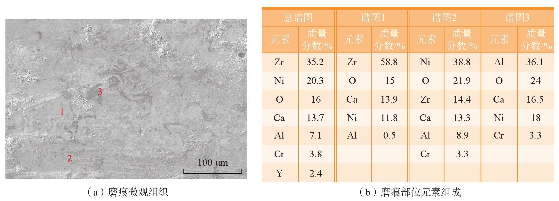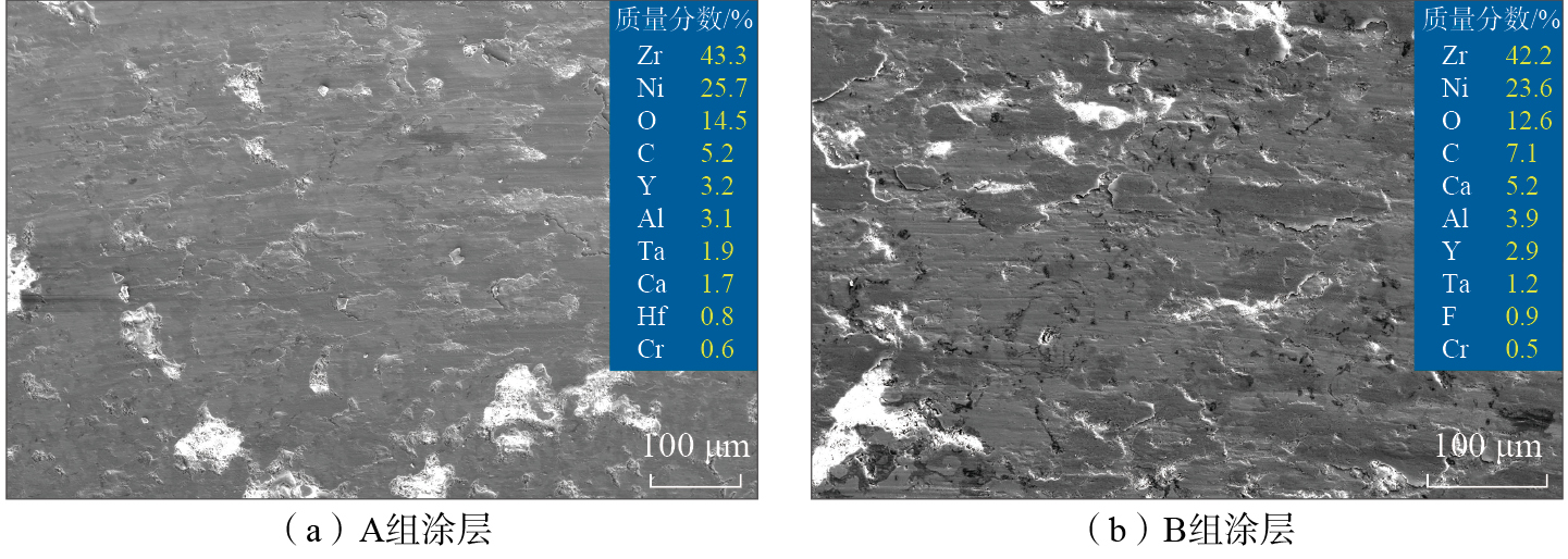 (3)高温(≥600 ℃)条件下,添加的CaF2润滑相通过韧脆转变降低了剪切强度以及摩擦系数,摩擦膜的动态形成与稳定性对降低磨损率具有关键作用,显著改善了涂层的摩擦学性能。1100 ℃下,A组涂层中Ca元素扩散并与ZrO2反应生成CaZrO3,形成均匀致密的釉质层,进一步降低摩擦系数至0.16,体现三元氧化物对高温润滑性能的积极作用。