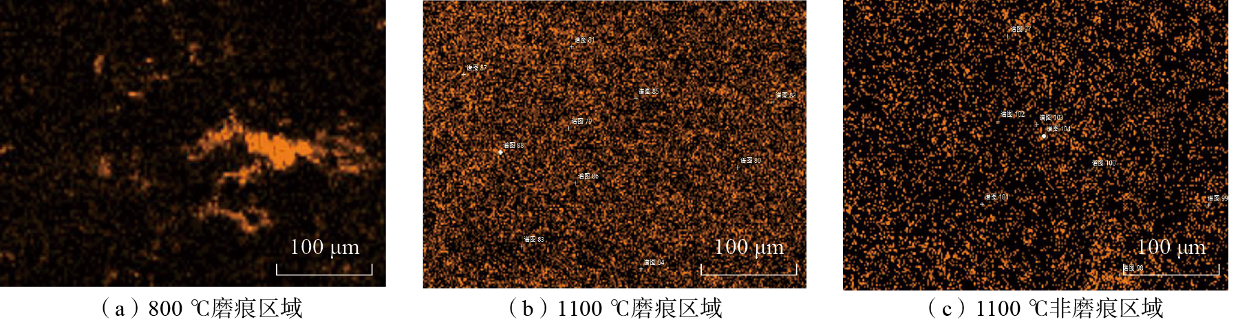 1100 ℃摩擦试验后,B组涂层破碎,无法观察形貌。图14为A组涂层在1100 ℃摩擦试验后的磨痕形貌,其磨痕较宽,釉质层更加平整光滑。磨痕表面由多种氧化物组成,主要为ZrO2基体、磨球材料较多的多种金属氧化物、Al2O3 3种。1100 ℃摩擦试验后的涂层表面Ca元素分布与其他温度不同,如图15所示,在室温~800 ℃下,涂层中的Ca元素均在涂层中团聚状分布,但在1100 ℃摩擦试验后,Ca元素在涂层表面均匀分布,根据图15(c)中1100 ℃后未摩擦区域Ca元素分布判断,磨痕处Ca元素的均匀分布同时受温度和摩擦两方面影响,温度使Ca元素发生扩散,摩擦协助了Ca元素均匀扩散。图8为A组涂层在1100 ℃摩擦试验后的XRD图像,根据元素与pdf基本卡片判断,图谱中主要出现3类峰,主峰为YSZ的特征峰,其次是CaZrO3特征峰,其余杂峰由Al2O3带来。判断在1100 ℃高温下,涂层中的Ca元素与ZrO2反应生成CaZrO3三元氧化物并参与釉质层的形成,形成光滑平整的釉质层,使涂层的摩擦系数降低。目前有多种三元氧化物对高温摩擦有益的报道[