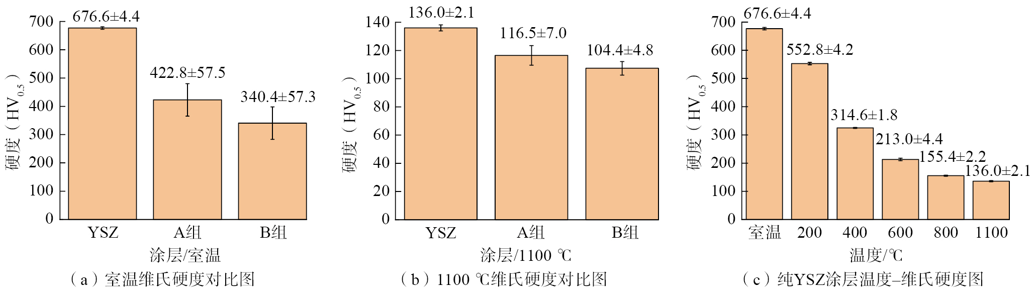 图4为室温和1100 ℃下两组涂层与纯YSZ涂层之间的硬度对比图。纯YSZ涂层在两个温度下的硬度分布较为稳定。室温下A、B两组涂层的显微维氏硬度值因测试点位的不同有较大波动,A组涂层的维氏硬度波动范围在344.42~537.44 HV0.5之间;B组涂层的维氏硬度波动范围在278.13~440.22 HV0.5之间。1100 ℃下两组涂层的硬度大幅度降低,但波动范围有所减小,A组涂层在108.4~126.8 HV0.5之间;B组涂层在100.8~114.1 HV0.5之间。可以看出,随添加相含量的增加,涂层的硬度下降。两组涂层的误差棒宽度相比纯YSZ涂层有很大升高,添加相的存在使涂层的硬度在室温下随选取点位的不同产生较大差异。图4(c)为纯YSZ涂层在室温~1100 ℃的维氏硬度数据,试验表明,纯YSZ涂层的硬度随温度升高而下降。