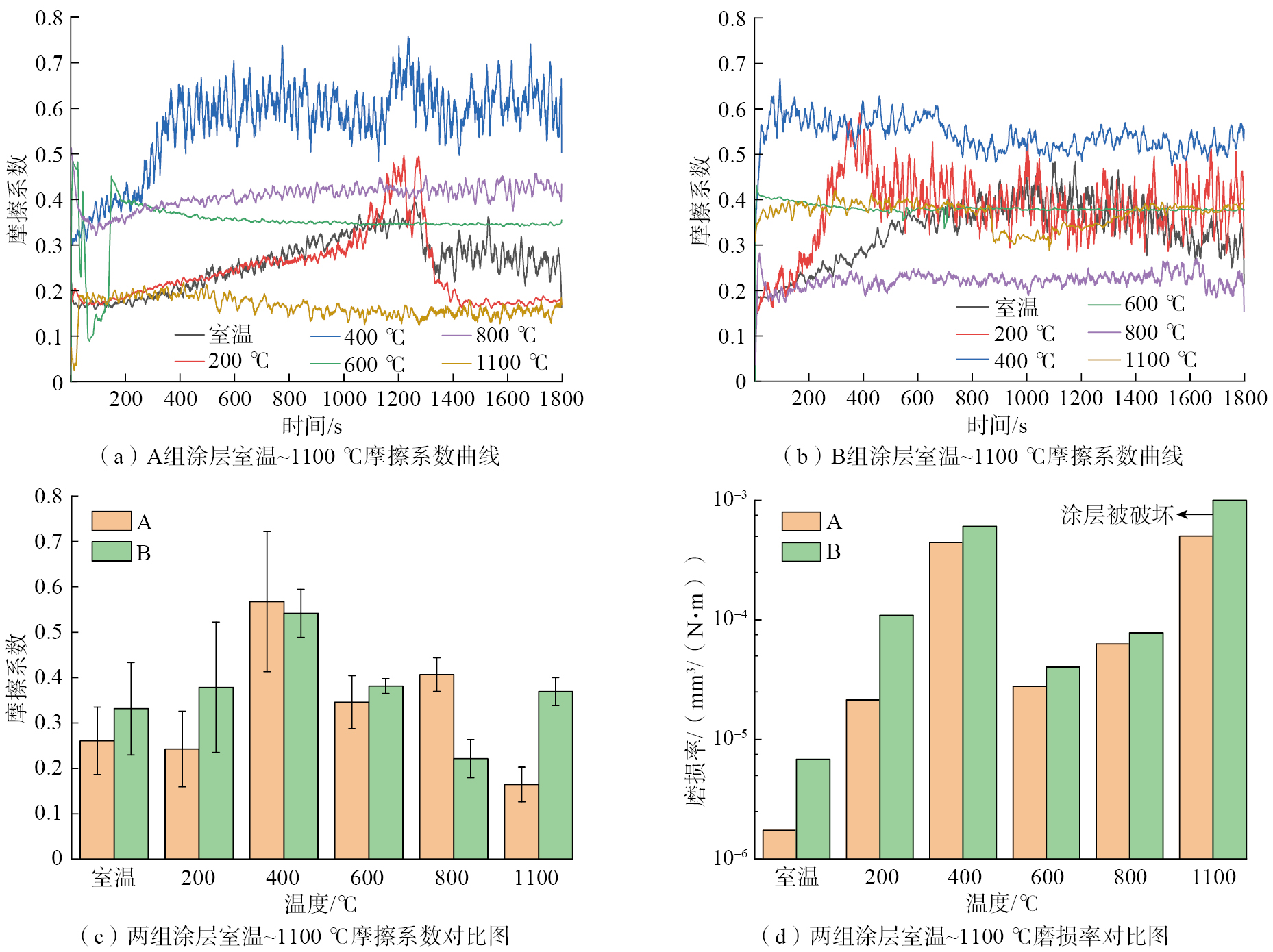 如图5所示,A组涂层在600~1100 ℃、B组涂层在400~1100 ℃时摩擦系数曲线很快达到稳定状态。A组涂层在室温~400 ℃、B组涂层在室温~200 ℃时的摩擦系数随摩擦进行先增加,在达到峰值后下降最后达到稳定状态。在低温度摩擦过程中,涂层随摩擦的进行,表面被不断破坏,摩擦表面粗糙度不断增大,使摩擦初期的摩擦系数不断增大,同时产生大量磨屑;在摩擦系数达到最大时,摩擦表面大面积被磨屑覆盖,摩擦过程主要由磨屑与对磨面进行接触,摩擦表面被破坏,使粗糙度上升的程度减小,取而代之的是磨屑在摩擦过程中不断被填充到凹坑中,使摩擦面粗糙度减小,摩擦系数下降,并在最后使表面粗糙度的增减达到动态平衡时保持平稳。由于A组涂层硬度较高,其被破坏的速度较低,在各个温度下相对B组涂层达到动态平衡的速度减小。在高温摩擦过程中,材料硬度减小,可以很快达到动态平衡。