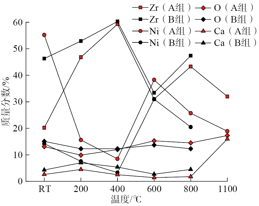 表4及图6为各温度摩擦试验后两组涂层磨痕部位的Zr、Ni、O、Ca元素分布数据,在各个温度摩擦试验后的磨痕中,A组涂层磨痕含Ni元素相对较多,B组涂层含Zr元素较多。Ca元素在B组涂层中质量分数相对较多,在室温~400 ℃时的磨痕表面质量分数高于600~800 ℃,但在1100 ℃的摩擦试验后质量分数突然上升。