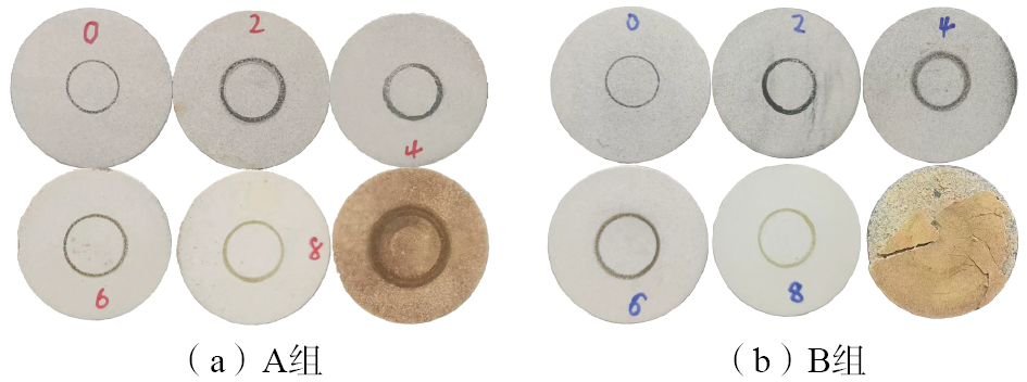 式中,W为磨损率,mm3/(N·m);F为磨损试验力,10 N;N为磨损圆周长,按照N = n×2πR计算,n为总转数(900转,即试验时间×转速)。