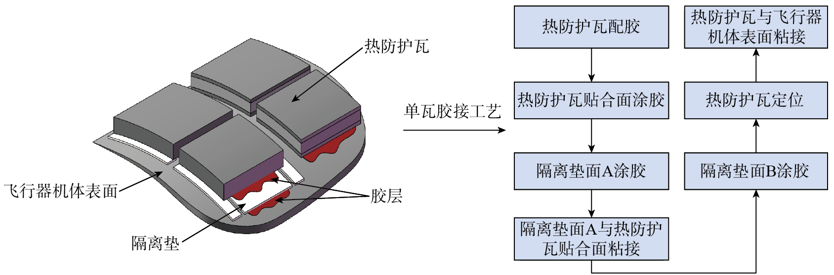 传统的热防护瓦装配以人工操作为主[ 郭朝邦, 李文杰. 高超声速飞行器结构材料与热防护系统[J]. 飞航导弹, 2010(4): 88-94.GUO Chaobang, LI Wenjie. Structural materials and thermal protection system of hypersonic vehicle[J]. Aerodynamic Missiles Journal, 2010(4): 88-94. 1],胶接工艺尤为关键,需严格遵循既定工艺顺序,如图1所示。以配胶、涂胶等工艺为例,配胶须按序控制胶体配比与搅拌时序,因对胶体流动性具有一定的要求,需目视判断胶体黏度;涂胶须严格遵循贴合面到隔离垫的涂覆顺序,并根据瓦块曲面调整施力角度和施力方向,确保表面平整无凸起,工艺具有动态过程复杂的特点,这些具有严格时序约束的行为构成了典型的胶接工艺时序行为。由于飞机表面热防护瓦块数量多达上万块,使得胶接工作量较大,因此胶接工艺时序行为对操作者的技能经验与专注度要求极高,极易因疲劳或规程执行偏差引发操作顺序出错、零件混装等不规范行为,从而影响装配质量、效率和安全。