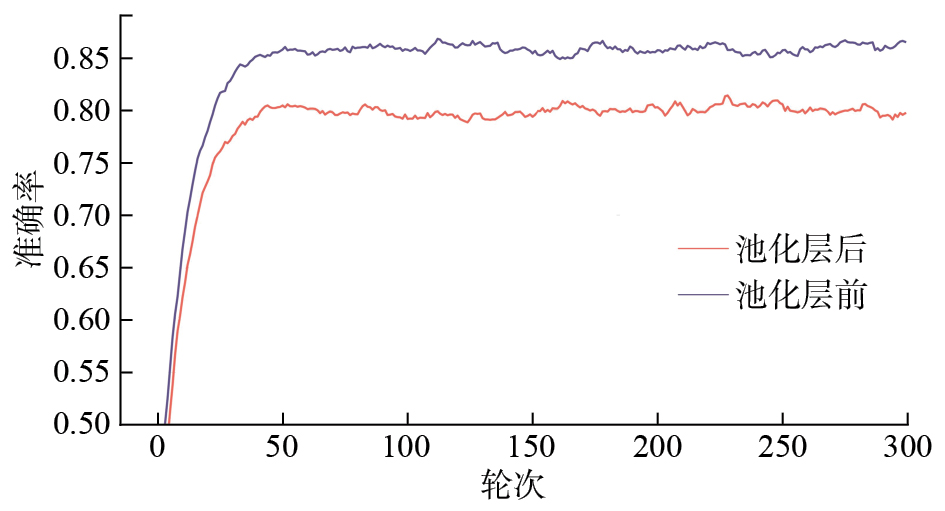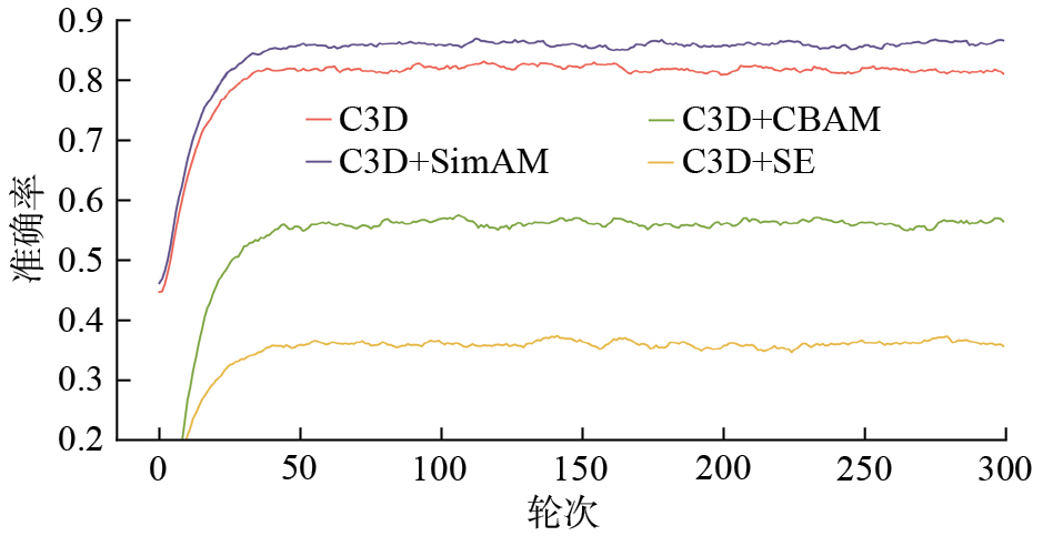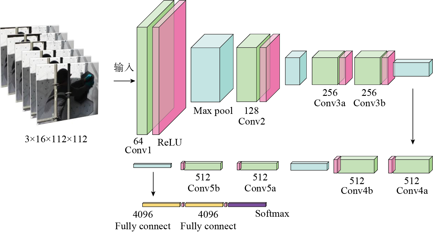 如图4所示,C3D网络由对称堆叠的卷积层、池化层以及全连接层构成。各卷积层的滤波器数量依次为64、128、256、512、512,所有卷积核尺寸均遵循Tran等[ TRAN D, BOURDEV L, FERGUS R, et al. Learning spatiotemporal features with 3D convolutional networks[C]//2015 IEEE International Conference on Computer Vision (ICCV). Santiago: IEEE, 2015: 4489-4497. 6]提出的最优设计准则,即采用3×3×3的时空卷积核,并设置步长(stride)与填充(padding)为1×1×1,以确保输入与输出的时空维度一致。特征图尺寸的缩减由3D最大池化层实现,首层池化核尺寸为1×2×2;其余池化层核尺寸与步长均为2×2×2。此设计避免了早期时间维度的过度下采样的同时适配标准16帧输入长度。网络的输入张量维度为(3×16×112×112),表示为C×L×H×W,其中C为通道数(RGB图像为3);L为时序长度(帧数);H与W分别为帧高与帧宽。训练过程中采用随机梯度下降(SGD)优化算法,激活函数为ReLU,并引入Dropout(P=0.5)以抑制过拟合[ 席志红, 冯宇. 基于改进型C3D网络的人体行为识别算法[J]. 应用科技, 2021, 48(5): 47-53.XI Zhihong, FENG Yu. A human behavior recognition algorithm based on improved C3D network[J]. Applied Science and Technology, 2021, 48(5): 47-53. 9]。