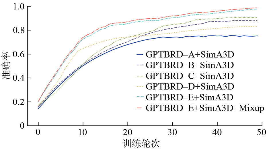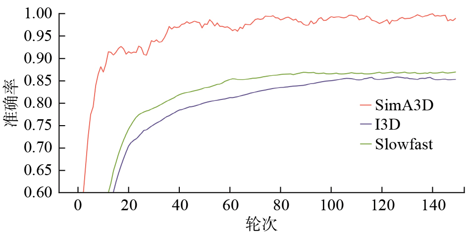 为了客观验证SimA3D模型及其优化方法的优越性,试验选取I3D[ Carreira J, Zisserman A. Quo vadis, action recognition, a new model and the kinetics dataset[C]. Proceedings of the IEEE Conference on Computer Vision and Pattern Recognition. 2017: 6299-6308. 25]和SlowFast[ Feichtenhofer C, Fan H, Malik J, et al. Slowfast networks for video recognition[C]. Proceedings of the IEEE/CVF International Conference on Computer Vision. 2019: 6202-6211. 26]作为基准模型。所有模型均在GPTBRD-E数据集下统一使用相同Mixup数据增强策略(α=0.4),并全部采用AdamW优化器(weight_decay=5e-4),配合余弦退火动态学习率策略(Tmax=20)。在相同的试验环境下,试验对比结果如图12所示。