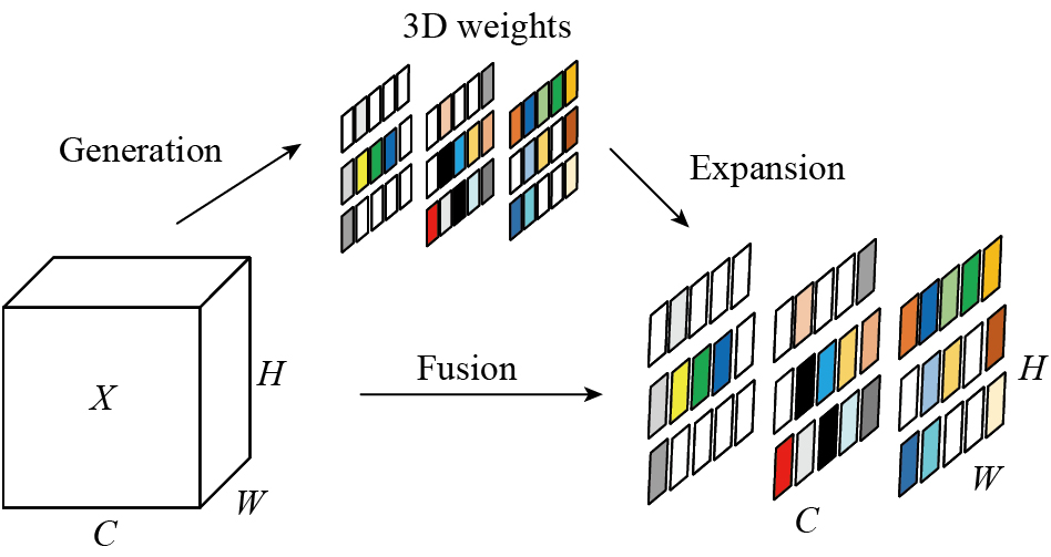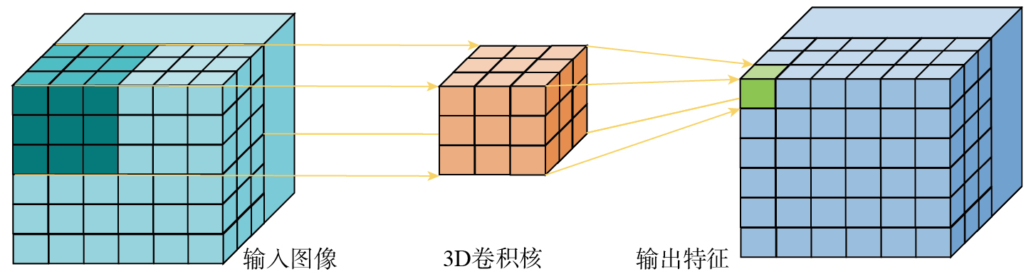 传统行为识别依赖于梯度方向直方图(HOG)、灰度共生矩阵(GLCM)和加速鲁棒特征(SURF)[ 乔琦. 装配过程中的动作识别与作业规范性判别方法研究[D]. 西安: 西安理工大学, 2023.QIAO Qi. Research on action recognition and operation normative discrimination method in manual assembly process[D]. Xi’an: Xi’an University of Technology, 2023. 3]等手工特征,面临预处理复杂、速度慢、稳定性不足等问题,难以有效捕捉动态时序细节。Carreira等[ CARREIRA J, ZISSERMAN A. Quo vadis, action recognition a new model and the kinetics dataset[C]//2017 IEEE Conference on Computer Vision and Pattern Recognition (CVPR). Honolulu: IEEE, 2017: 4724-4733. 4]提出了膨胀3D模型(I3D),通过将一个现有优秀2D模型扩张到3D,避免重构3D网络的巨大工作量,其精度首次超越手工特征方法,推动了行为识别领域的深度学习研究。当前基于双流CNN与3D卷积神经网络的人体行为识别算法已成为主流方法[ 邹新雷. 基于3D卷积神经网络的行为识别研究与应用[D]. 成都: 电子科技大学, 2022.ZOU Xinlei. Research and application of action recognition based on 3D convolutional neural networks[D]. Chengdu: University of Electronic Science and Technology of China, 2022. 5]。双流CNN模型由于需要提取光流,因而速度不佳;3D卷积核则是通过扩展时间维度(帧序列)可直接提取时空特征,如图2所示,契合行为识别对连续动作建模的需求,2015年,Tran等[ TRAN D, BOURDEV L, FERGUS R, et al. Learning spatiotemporal features with 3D convolutional networks[C]//2015 IEEE International Conference on Computer Vision (ICCV). Santiago: IEEE, 2015: 4489-4497. 6]提出的C3D模型采用纯3D卷积核堆叠结构,通过多层3D卷积和池化操作逐层捕捉行为模式,使用UCF101数据集训练,识别率为85.2%。但该模型应用于胶接工艺时序行为识别任务时,测试准确率仅为78.42%。