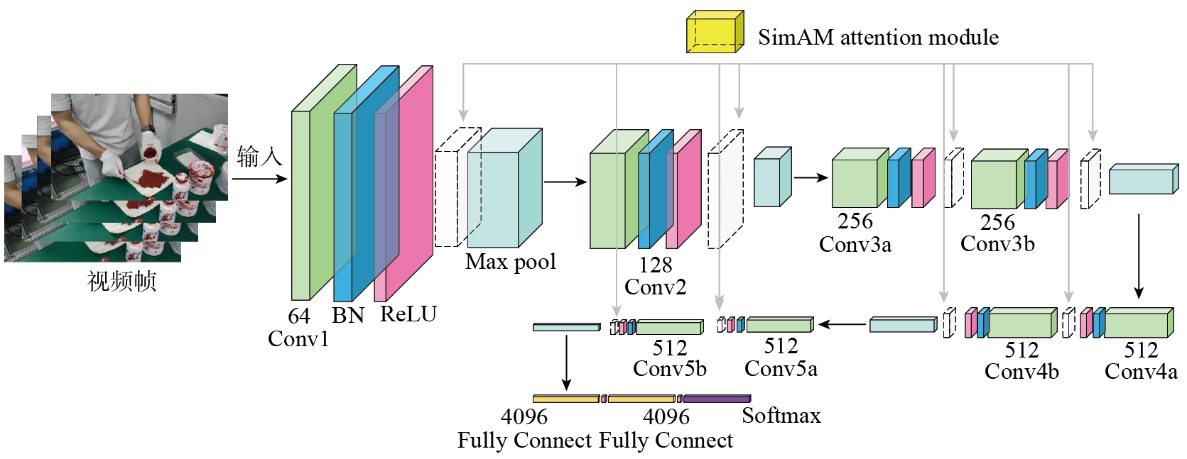 胶接工艺时序行为的特点包括:(1)高动态性。关键操作在时间轴上呈现密集的特征,传统3D卷积神经网络(C3D)的固定时序采样易导致关键帧信息丢失。(2)局部显著性。特定时间点的微小动作对整体装配质量具有决定性影响,需增强模型对局部时空特征的敏感性。因此要求网络精准聚焦关键帧并抑制冗余时序噪声。标准C3D网络因均匀池化与固定卷积核限制,难以动态调整时空特征权重。为此,本文引入SimAM无参注意力机制[ YANG L X, ZHANG R Y, LI L D, et al. SimAM: A simple, parameter-free attention module for convolutional neural networks[C]//International Conference on Machine Learning. New York: PMLR, 2021. 10],通过轻量化特征校准提升高动态时序行为的建模能力。