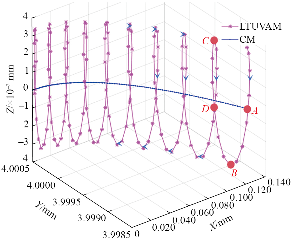 LTUVAM的运动轨迹揭示出该过程包含4个主要阶段:周期性接触阶段、持续冲击阶段、变速阶段和熨压阶段。在周期性接触与分离阶段,经过二次雾化的切削雾滴能够更好地渗透到切削区的微小空隙中,从而提供有效的润滑和冷却作用,带走大量切削热。此外,液滴的流动性有助于清除已加工表面上的切屑,减少切屑对已加工表面造成的二次损伤,从而降低表面缺陷的发生概率。在持续冲击阶段,刀具以极高的速度切入工件,产生巨大的瞬时冲击力,当刀具与Si颗粒发生碰撞时,在其周围区域形成应力集中,产生大量切削热,致使工件表面温度迅速升高,引发材料的热软化,从而降低切削力。在变速阶段,切屑的破碎与排除得到进一步促进,此时,MQL的应用可加速切屑的清除,进一步提升加工效率,同时,LTUVAM的周期性往复运动使得刀具对已加工表面进行持续的往复熨压,细小的雾滴能够在已加工表面形成一层保护膜,减少刀具与工件表面之间的摩擦,降低切削温度,从而有效提高加工精度与表面质量[ XIANG D H, SU B, WANG D Z, et al. Ultrasonic longitudinal-torsional vibration helical milling internal thread of SiCp/Al composites: Finite element simulation and machining quality research[J]. Journal of Manufacturing Processes, 2024, 131: 1833-1845. 18]。