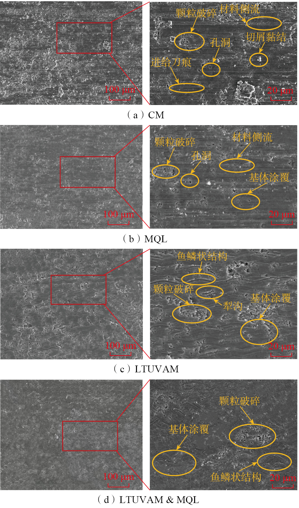 在每齿进给量为0.025 mm/z,切削速度为40 m/min,切削深度为2 mm的条件下,不同加工方式的表面粗糙度如图9所示。4种切削条件下的表面粗糙度,排序依次为LTUVAM & MQL<LTUVAM<MQL<CM。相比于CM,LTUVAM的表面粗糙度降低约47.8%,MQL表面粗糙度降低约10.9%,LTUVAM & MQL表面粗糙度降低约58.5%。CM刀具剪切作用较弱,部分区域内颗粒切削不完全出现犁耕作用并产生大孔洞,使得表面粗糙度增大。LTUVAM在Al基体去除过程中,由于刀具独特的运动轨迹,使得已加工表面形成均匀的鱼鳞状纹路,弱化孔洞所造成的负面影响,进一步减小了表面粗糙度。采用MQL加工时,润滑液的流动性能有效地带走已加工表面残留的微小切屑碎片与抑制刀刃附近材料的积累,进而降低表面粗糙度。采用LTUVAM & MQL时,刀具的高频振动使得后刀面对已加工表面产生超声熨压效应[ PENG Z L, ZHANG X Y, ZHANG D Y. Improvement of Ti-6Al-4V surface integrity through the use of high-speed ultrasonic vibration cutting[J]. Tribology International, 2021, 160: 107025. 23]可以改善残留高度,但熨压过程中的摩擦环境较为恶劣,MQL恰好弥补了这个缺点。超声空化后的雾滴能更好地进入切削区,为熨压表面提供润滑膜,降低接触表面的摩擦系数,减小切削力与切削温度,材料去除更加完全,颗粒破碎细化程度高,进一步降低表面粗糙度。当LTUVAM & MQL处理后的材料被用于航空器热防护结构时,其超低表面粗糙度可减少热量传递,提升材料耐久性,增强结构稳定性,在高温环境下更有效地保护航空器内部组件,延长使用寿命,确保可靠性和安全性,从而整体提升航空器性能与运行效率。