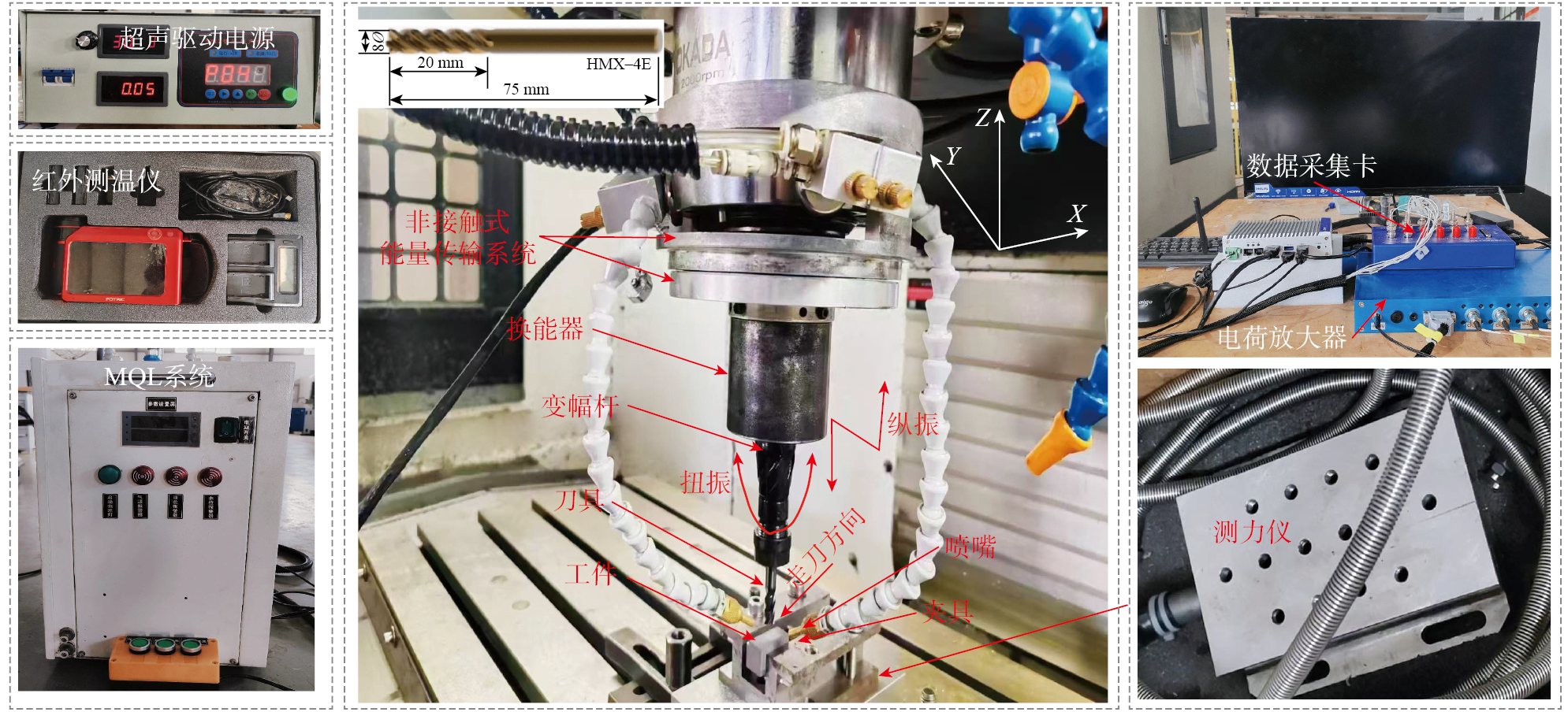 微量润滑(Minimum quantity lubrication,MQL)技术是将压缩空气与微量切削液混合雾化成μm级液滴,定向喷射至刀具-工件接触界面,形成极薄润滑膜。Dhar等[ DHAR N R, KAMRUZZAMAN M, AHMED M. Effect of minimum quantity lubrication (MQL) on tool wear and surface roughness in turning AISI-4340 steel[J]. Journal of Materials Processing Technology, 2006, 172(2): 299-304. 2]研究得出微量润滑技术可降低切削区温度,减少刀具磨损和表面粗糙度。荆露等[ 荆露, 牛秋林, 陈明, 等. 超临界CO2微量润滑铣削Al-42wt% Si合金切削加工性研究[J]. 工具技术, 2022, 56(7): 8-13.JING Lu, NIU Qiulin, CHEN Ming, et al. Study on machinability of milling Al-42wt% Si alloy by supercritical CO2 micro-lubrication[J]. Tool Engineering, 2022, 56(7): 8-13. 3]在加工Al-50% Si合金(Si质量分数为50%)时,发现scCO2-MQL介质能够有效去除颗粒,促进Al基体的涂覆,改善工件表面质量,但随着每齿进给量的增加,铝基体对表面的涂覆作用将逐步被破坏并产生表面撕裂,恶化表面质量。Shokrani等[ SHOKRANI A, AL-SAMARRAI I, NEWMAN S T. Hybrid cryogenic MQL for improving tool life in machining of Ti-6Al-4V titanium alloy[J]. Journal of Manufacturing Processes, 2019, 43: 229-243. 4]研究表明,MQL可以在低、中等切削速度下有效润滑切削区域,并减少由第二和第三变形区摩擦产生的热量,改善加工表面质量,但高速切削时,切削液难以有效进入切削区,MQL的冷却和润滑效果降低,表面质量下降。纵扭超声振动辅助铣削(Longitudinal torsional ultrasonic vibration-assisted milling,LTUVAM)是在刀具轴向与扭转方向上施加高频微幅振动,以实现刀具-工件间的周期性接触-分离。崔鑫[ 崔鑫. 三维超声振动切削技术的研究[D]. 沈阳: 东北大学, 2012.CUI Xin. Research on three-dimensional ultrasonic vibration cutting technology[D]. Shenyang: Northeastern University, 2012. 5]通过研究得出超声振动切削的分离特性有效地降低了切削过程中切削力与切削热,大幅提高了加工精度与刀具的使用寿命,弥补了传统金属切削技术在精密加工、难加工材料加工等领域的不足。Jie等[ XU J, FENG P F, FENG F, et al. Subsurface damage and burr improvements of aramid fiber reinforced plastics by using longitudinal-torsional ultrasonic vibration milling[J]. Journal of Materials Processing Technology, 2021, 297: 117265. 6]通过建立AFRP切削数值模型、理论计算与开展芳纶纤维增强复合材料加工试验,发现纵扭超声振动辅助铣削能够有效地改善工件表面裂纹与亚表面损伤。陈德雄等[ 陈德雄, 井绪芹. 钛合金椭圆超声振动辅助切削表面质量仿真研究[J]. 航空制造技术, 2022, 65(15): 87-94.CHEN Dexiong, JING Xuqin. Simulation study on surface quality of titanium alloy in elliptical ultrasonic vibration-assisted machining[J]. Aeronautical Manufacturing Technology, 2022, 65(15): 87-94. 7]在椭圆超声振动铣削试验中得出,增大X方向的振幅,可使工件表面形貌完整性更好;但Y方向振幅增大时,每个椭圆轨迹之间相交距离增大,引起工件表面形貌完整性恶化,降低工件表面质量。Li等[ SHI Z L, XIANG D H, FENG H R, et al. Finite element and experimental analysis of ultrasonic vibration milling of high-volume fraction SiCp/Al composites[J]. International Journal of Precision Engineering and Manufacturing, 2021, 22(10): 1777-1789. 8]采用有限元与试验相结合的方法,系统探究了高体积SiCp/Al复合材料在纵扭超声铣削过程中的加工特性,发现随着超声频率的增加,铣削刃口的比例增加,导致表面粗糙度会出现阶段性的增大,显著影响已加工表面质量。为了进一步改善工件表面质量,学者们提出了超声振动与微量润滑耦合复合加工。王大中[ 王大中, 吴淑晶, 林靖朋, 等. 基于MQL的超声椭圆振动微切削Inconel718的机理研究[J]. 机械工程学报, 2021, 57(9): 264-272.WANG Dazhong, WU Shujing, LIN Jingpeng, et al. Research on ultrasonic elliptical vibration micro-cutting Inconel718 based on minimum quantity lubrication[J]. Journal of Mechanical Engineering, 2021, 57(9): 264-272. 9]和戎杰[ 戎杰. 基于超声振动与微量润滑耦合机制的钛合金铣削表面质量研究[D]. 湘潭: 湖南科技大学, 2023.RONG Jie. Research on surface quality of titanium alloy milling based on coupling mechanism of ultrasonic vibration and minimal quantity lubrication[D]. Xiangtan: Hunan University of Science and Technology, 2023. 10]等在均质材料切削试验过程中发现超声振动与微量润滑耦合切削相较于常规切削,切削温度与切削力大幅度降低,表面质量得到提升,切削性能得到改善。现有研究表明,超声振动辅助微量润滑加工技术能够显著降低切削力与切削温度,并有效改善工件表面质量。但在针对高硅铝合金的超声振动辅助微量润滑加工研究尚不充分,相关报道较少。