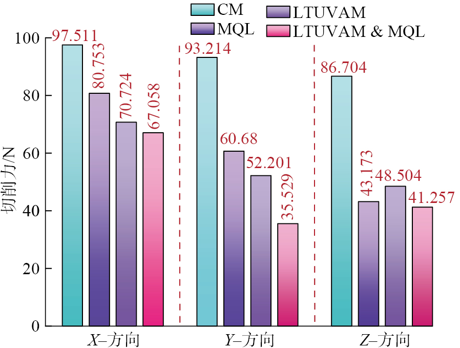 在每齿进给量为0.025 mm/z,切削速度为40 m/min,切削深度为2 mm下,不同加工方式铣削Al-50% Si合金的切削力变化如图5所示。无论在x、y和z的哪一个方向,LTUVAM、MQL与LTUVAM & MQL铣削力均低于CM。相比于CM,LTUVAM切削力降低约38.3%;MQL切削力降低约34.1%;LTUVAM & MQL切削力降低约45.6%。其中,LTUVAM降低切削力的机制在于加入超声振动后,刀具与工件的接触状态由持续冲击转换为周期性分离,刀具净切削时间缩短,并且刀具高频振动所引发的冲击作用促进了局部塑性变形,形成软化效应[ CUI F J, ZHANG H, YANG M H, et al. Multiscale simulation and experimental study on ultrasonic vibration assisted machining of SiCp/Al composites considering acoustic softening[J]. Journal of Materials Processing Technology, 2025, 335: 118649. 21],降低材料的流动应力,致使切削力下降。采用MQL加工时,润滑液渗入刀-工具接触界面,有效降低接触界面的摩擦系数,从而增大剪切角,进一步降低切削力。在LTUVAM & MQL加工时,MQL喷射出的雾滴到达刀具表面后,在超声雾化作用下进一步细化,细化后的雾滴到达切削区域后,在刀具高频振动作用下加速渗透到刀具-切屑接触界面,并提供足够的润滑,从而可降低切削力。因此,LTUVAM & MQL加工方式为降低切削力提供了良好的工艺条件。