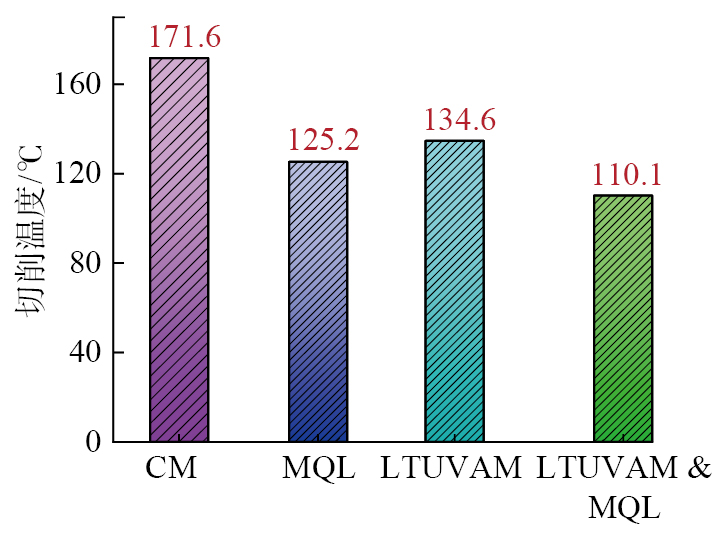 在每齿进给量为0.025 mm/z、切削速度为40m/min、切削深度为2 mm下,不同加工方式的温度如图7所示,4种切削条件下的切削温度排序为LTUVAM &MQL<MQL<LTUVAM<CM。相比于CM,MQL切削温度降低约27.2%;LTUVAM切削温度降低约21.6%;LTUVAM & MQL切削温度降低约35.8%。其中,LTUVAM产生的切削温度低于CM,这是因为超声振动引起的高频振动波能够在刀具与工件接触区域产生微观的周期性振动,这种振动效应促使切削区域的热量迅速扩散。振动引起的局部微观位移可以打破热量在刀具和工件之间的积聚[ GAO H H, MA B J, ZHU Y P, et al. Enhancement of machinability and surface quality of Ti-6Al-4V by longitudinal ultrasonic vibration-assisted milling under dry conditions[J]. Measurement, 2022, 187: 110324. 22],从而加速热量的传导,降低切削区的温度。采用MQL加工时,到达切削区的混合雾滴在高温作用下迅速蒸发汽化,带走大量的热,进一步降低了切削温度。而在使用LTUVAM & MQL时产生的切削温度最低,这是由于超声振动的往复熨压使切削液更均匀地覆盖在已加工表面,且Al基体表面的裂纹与Si颗粒的剥落有利于切削液的存储,提高了冷却、润滑效果,降低了摩擦并增强了切削区域对流换热,减少了热积累。综上所述,LTUVAM & MQL加工为硅铝合金的铣削提供了良好的冷却和润滑条件。