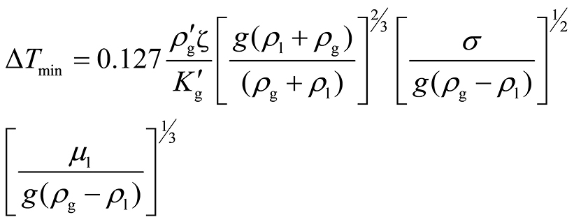 不同的ΔT对应不同的阶段,根据沸腾传热机理,即产生气泡的最小沸腾程度和膜沸腾传热公式[ ZHANG J C, LI C H, ZHANG Y B, et al. Temperature field model and experimental verification on cryogenic air nanofluid minimum quantity lubrication grinding[J]. The International Journal of Advanced Manufacturing Technology, 2018, 97(1): 209-228. 12],可以用下列式(6)和(7)确定切削区冷却介质的传热状态。